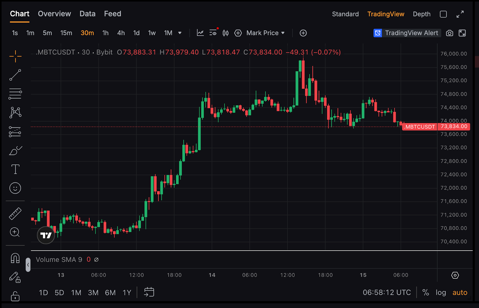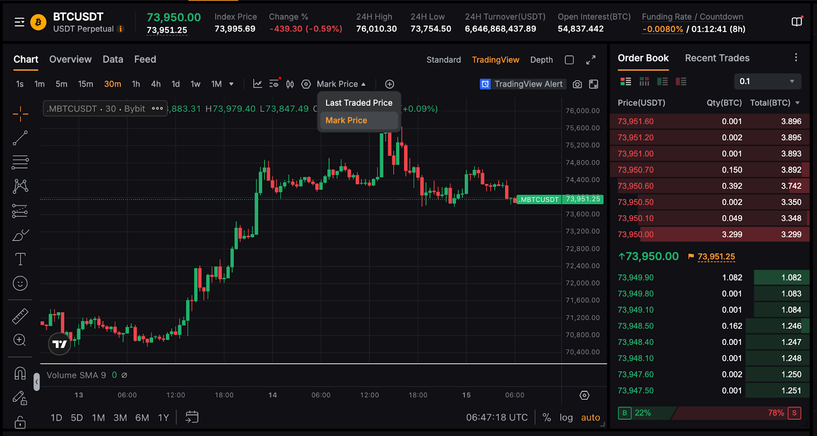 Anda dapat memeriksa Harga Mark Saat Ini dari harga bertanda oranye di buku pesanan atau melihat Harga Mark di grafik trading dengan mengeklik Harga Trading Terakhir dan memilih Harga Mark.