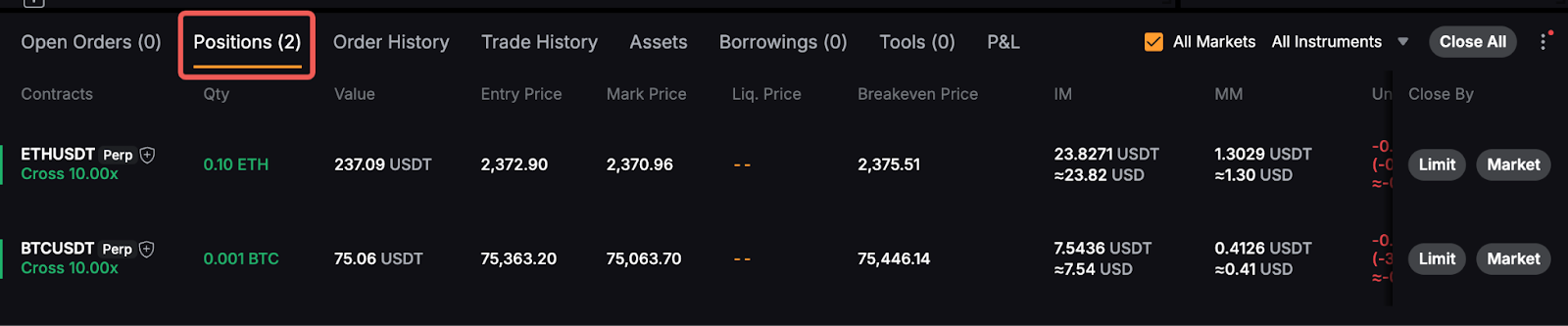 Secara default, L&R belum terealisasi di tab posisi dihitung berdasarkan Harga Trading Terakhir dan tidak termasuk biaya pendanaan atau biaya trading.