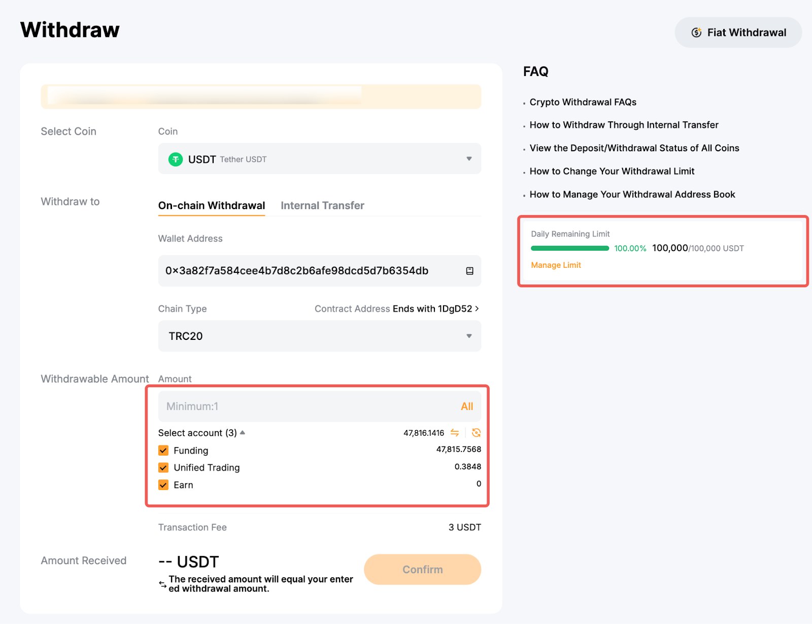 Anda dapat memilih untuk menarik saldo yang tersedia dari akun Pendanaan, Perdagangan Terpadu, atau Earn. Anda juga dapat melihat sisa batas penarikan harian dan bulanan di sisi kanan halaman. Untuk mengubah batas penarikan Anda, ikuti panduan di sini.