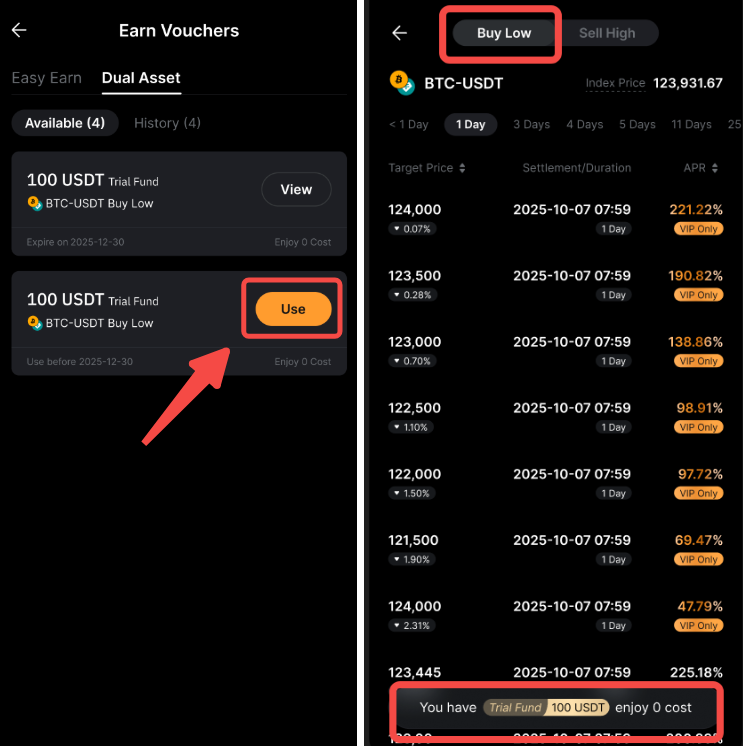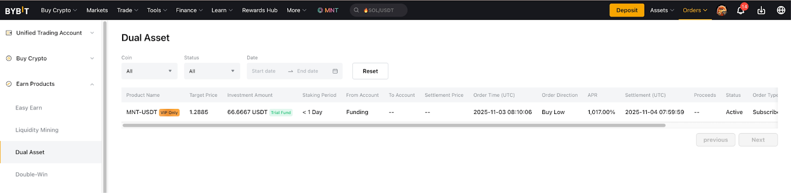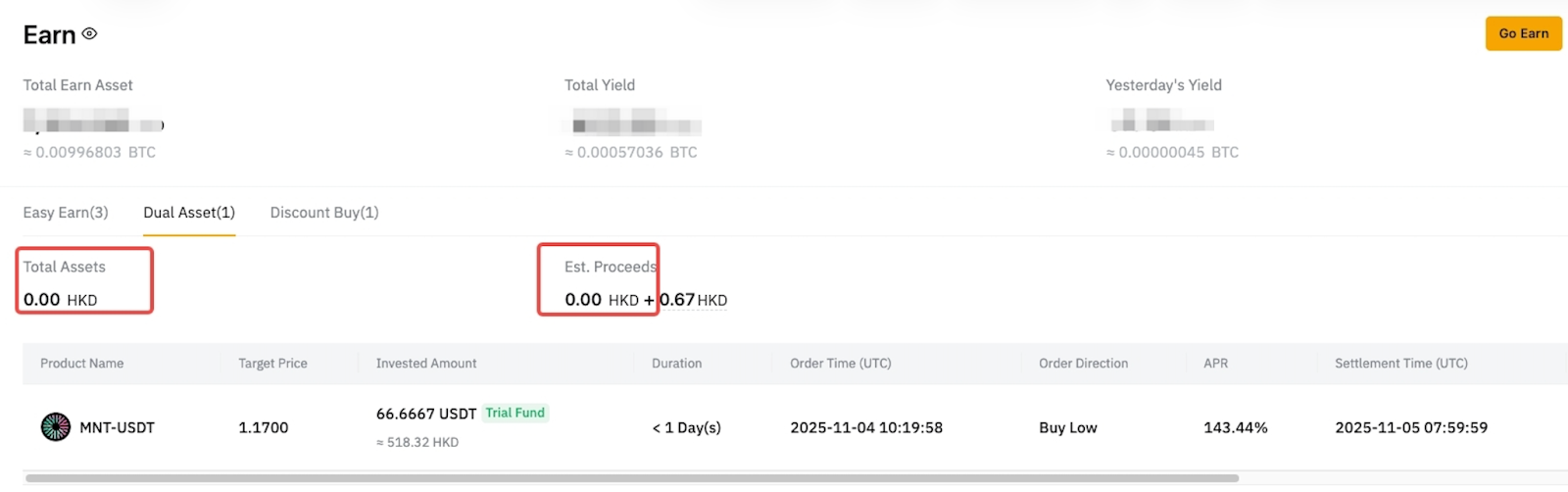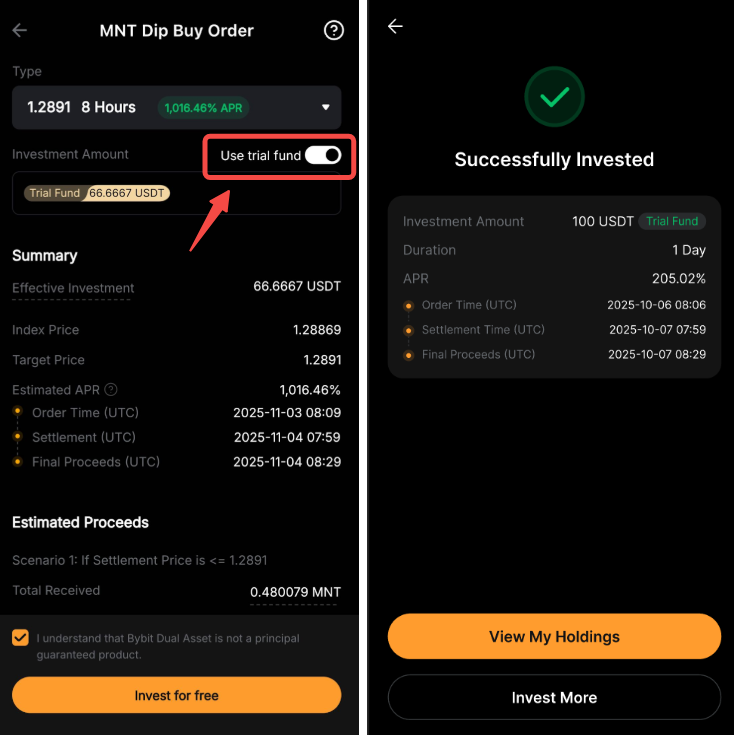 デュアルアセットトライアルファンドでは、コストを被ることなく、実際のデュアルアセットのリターンを体験できます。収益は、製品の決済価格とAPRによって決定されます。利回りはあなたの口座に追加されますが、トライアルファンドの元本はあなたの総資産にカウントされません。