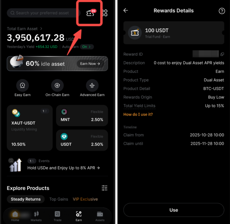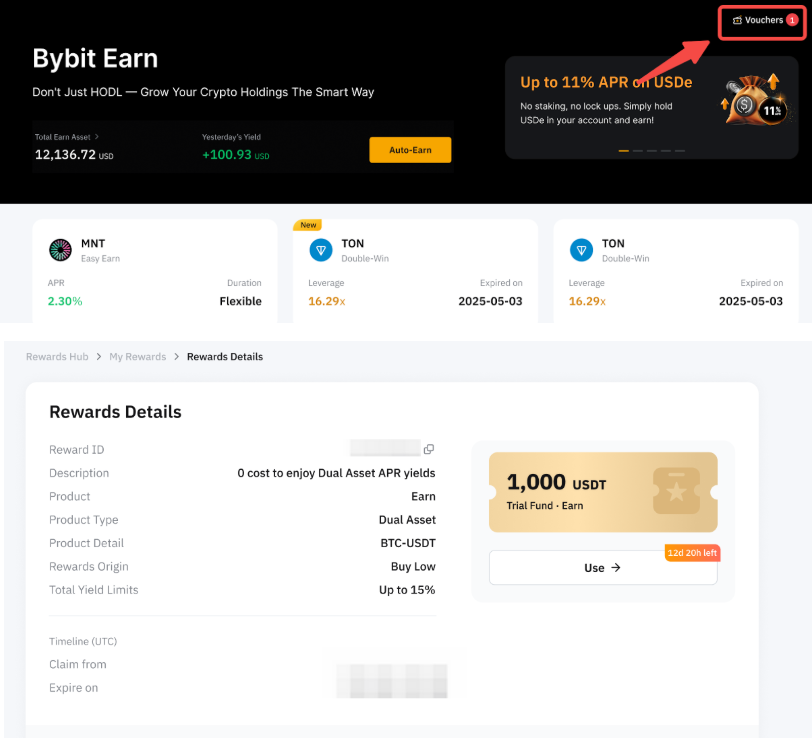 デュアルアセット商品のトライアルファンドを受け取る資格がある場合は、Bybit Earnページの右上隅にある「バウチャー」セクションから特典をご確認いただけます。または、My Rewards ページでもトライアルファンドのリワードを見つけることができます。