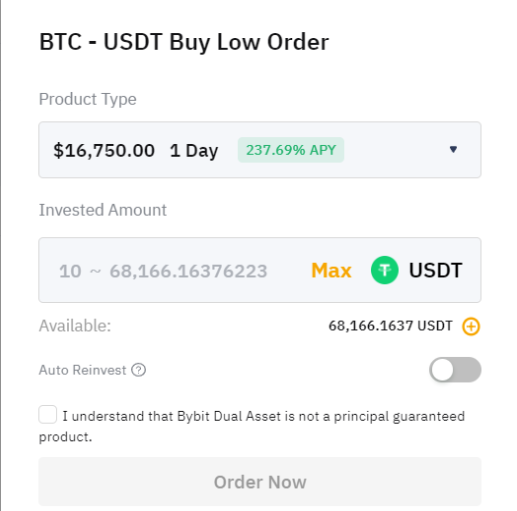 APR(年間収益率)は保証されます。ただし、市場の変動により、資産価値の点では、利益は保証されません。決済日には、決済価格がターゲット価格に達したかどうかに応じて、収益はステーブルコイン(USDT)または購入した暗号資産の通貨タイプで決済されます。