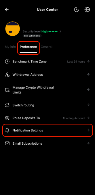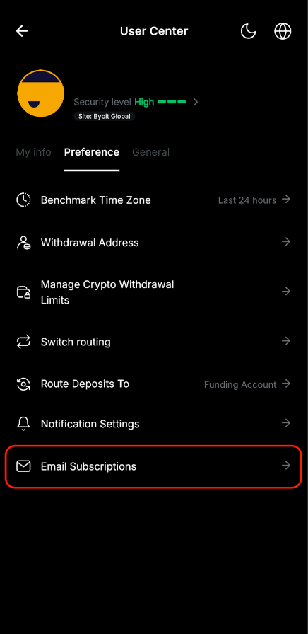 BybitのEメール配信を停止するには、ホームページの左上隅にあるプロフィールアイコンをクリックして設定ページに移動し、設定アイコンをクリックします。次に、プリファレンス → Eメール配信サービスをクリックし、登録したEメールアドレスで受信するイベントリマインダー一般通知をカスタマイズできます。