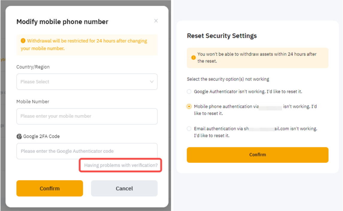 2段階認証ウインドウで、認証に問題があるをクリックし、利用できない認証方法を選択してください。情報を入力し、リクエストが承認されると、カスタマーサポートが2段階認証の再設定をお手伝いします。