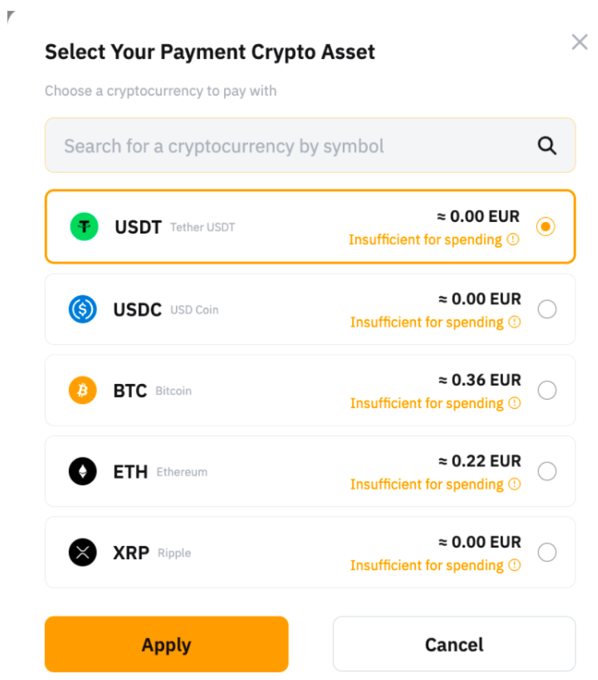 Bybitカード取引では、最大6種類の決済暗号資産を選択できます。デフォルトの決済優先順位は、USDT > USDC > TON > BTC > ETH > XRPです。ただし、カードダッシュボードのページで、注文の追加、削除、変更など、支出通貨を管理できます。