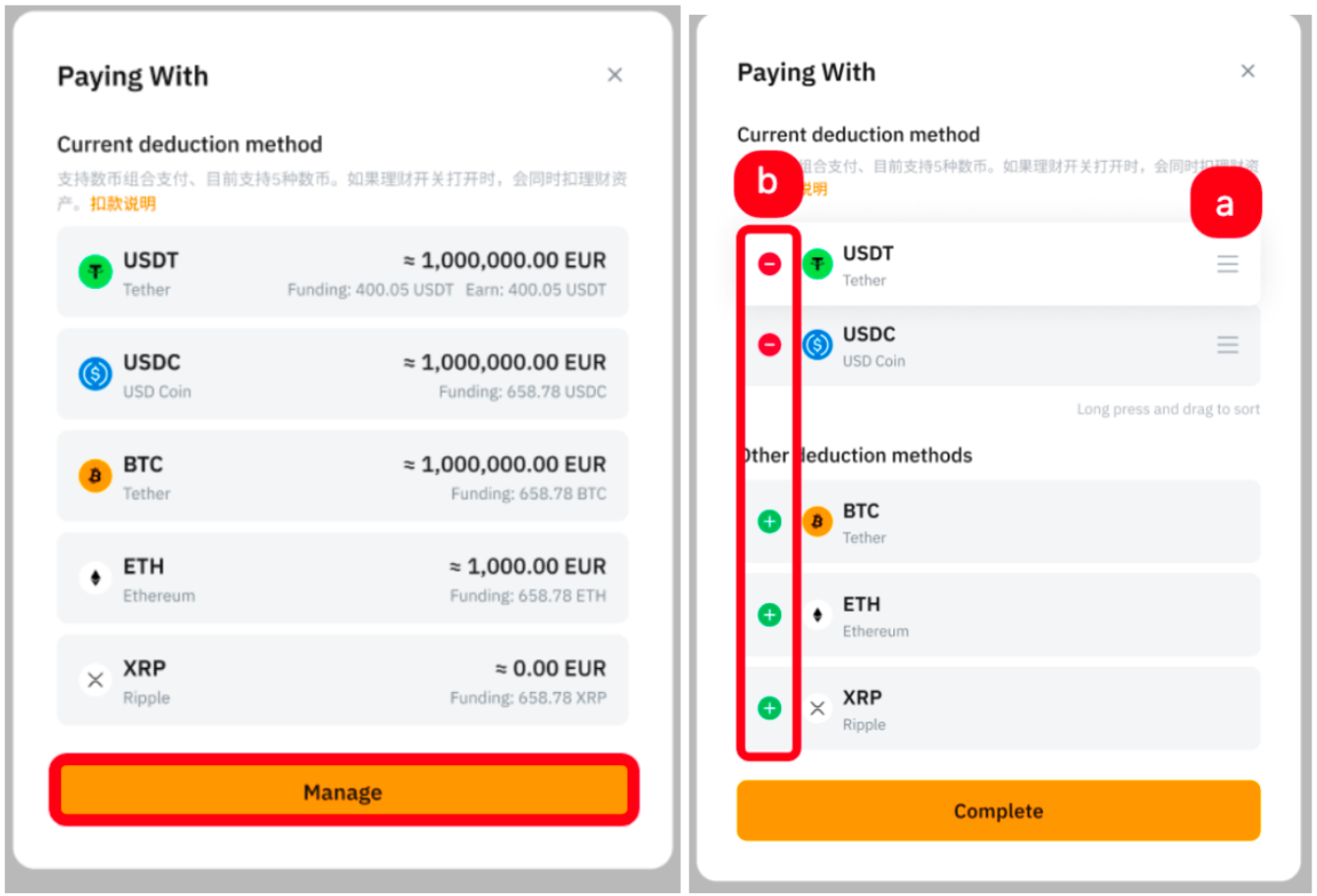 お支払い方法をクリックすると、管理ウィンドウが表示されます。次に、(a) 注文を上下にドラッグして管理するか、(b) リストから通貨を追加・削除します。完了後、Bybitカードで購入できます。システムは設定した支払い優先順位に従います。