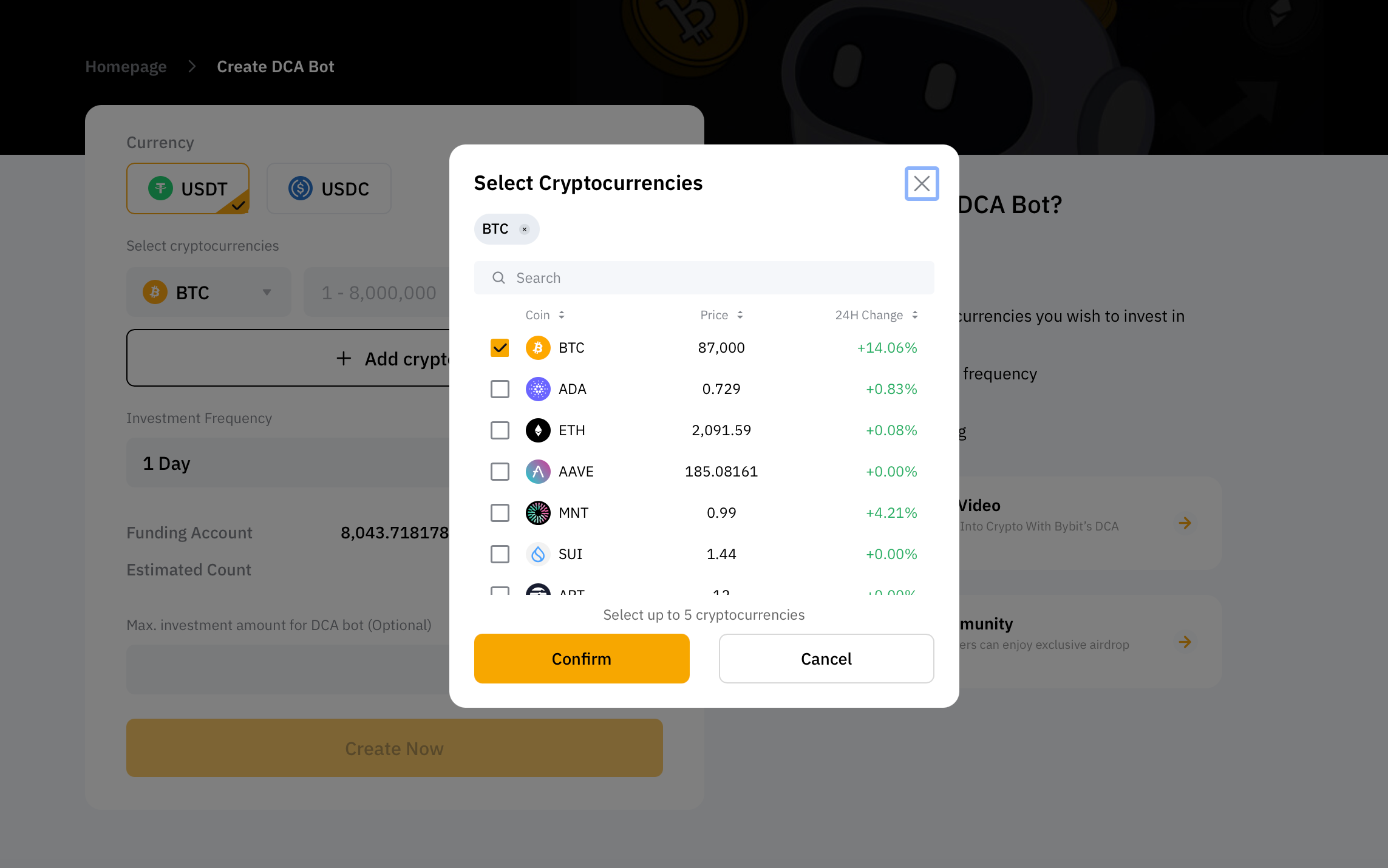 1つの積立ボットにつき最大5種類の通貨を選択することができます。