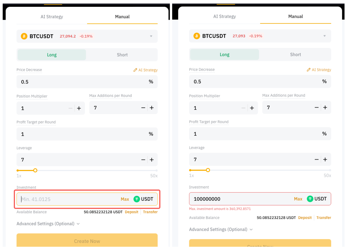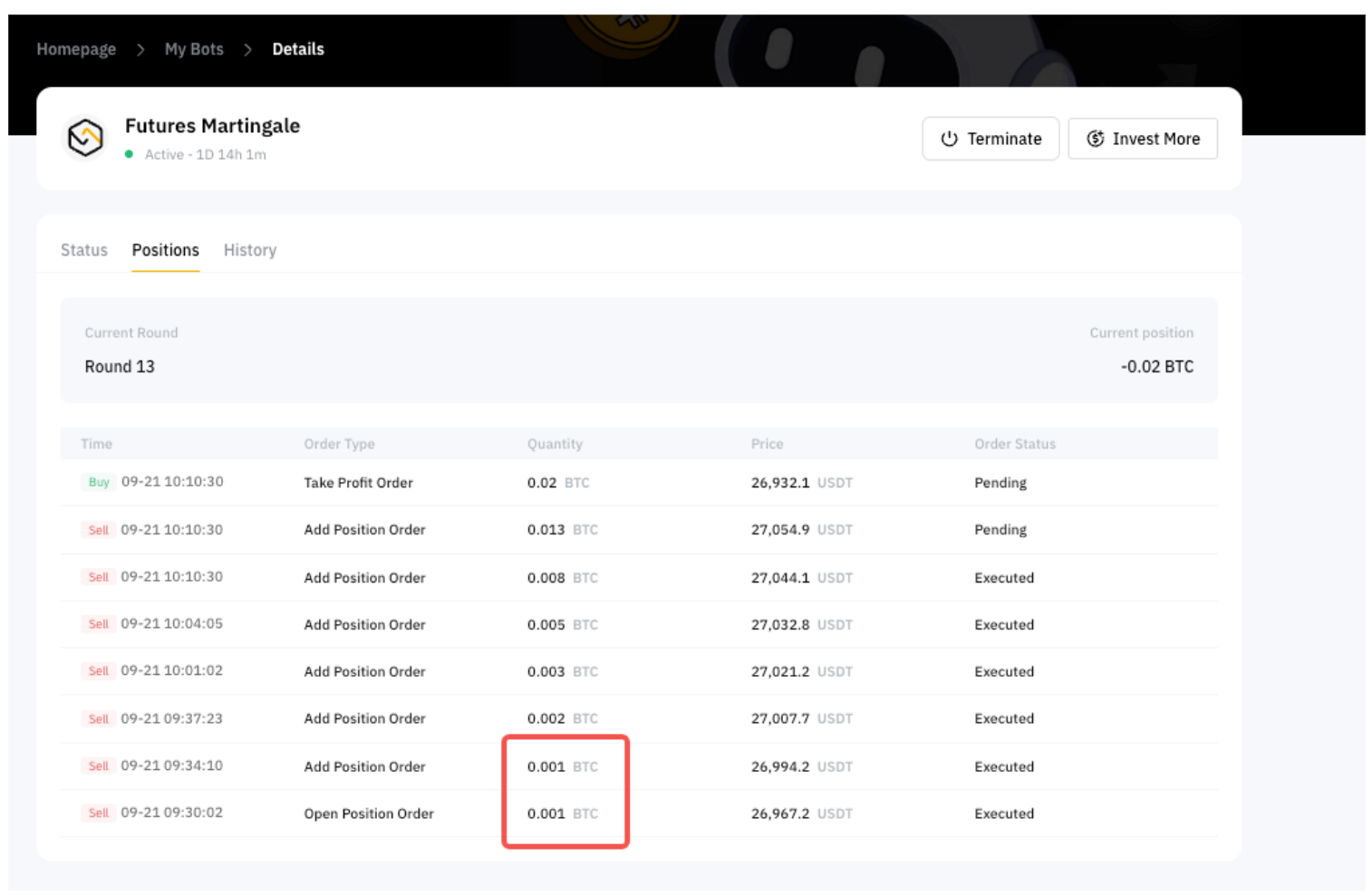 - 先物マーチンゲール取引ボットを使用してUSDT無期限契約を取引する場合、最低注文サイズの要件が適用され、これを満たす必要があります。注文に対する証拠金の算出にあたり、算出した証拠金がこの最低要件を下回った場合、システムは自動的に注文数量を切り上げ、この要件を満たします。こうした切り上げ処理により、前回の注文と追加注文の比率が、あらかじめ定義されたポジション倍率と一致しないことがあります。