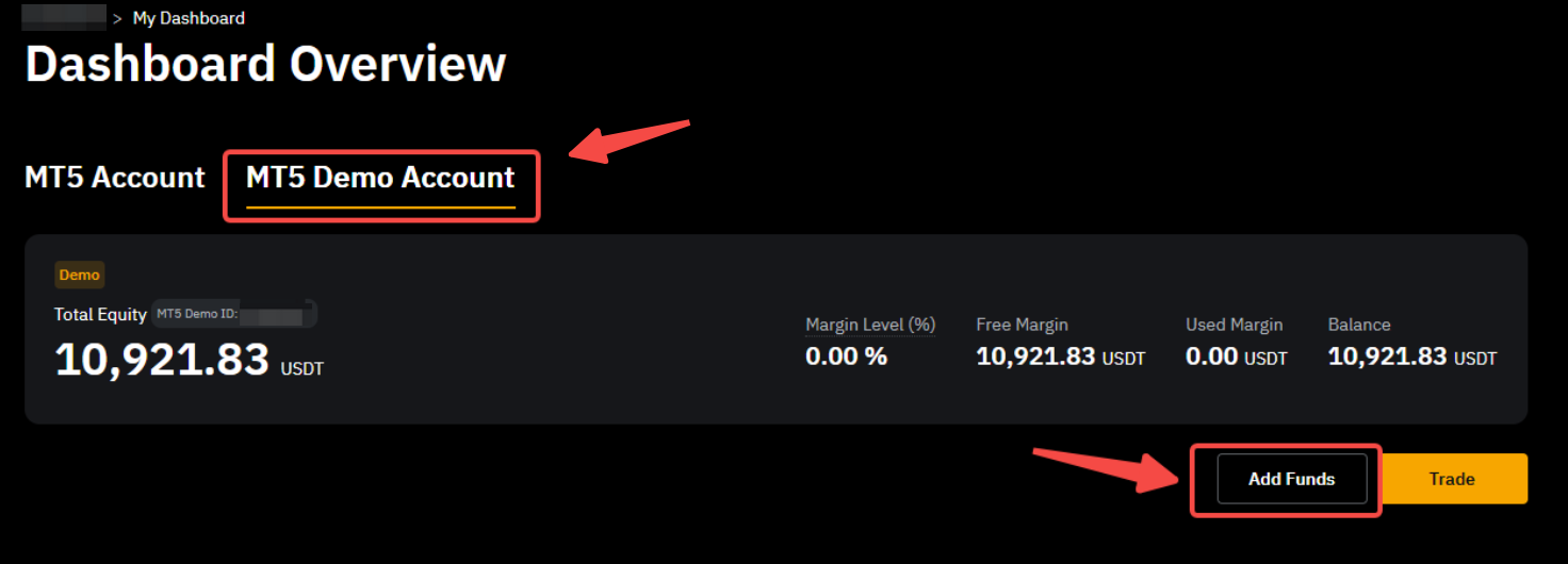 以下のスクリーンショットに示すように、デモアカウントダッシュボードにアクセスし、「転送」をクリックして、デモ資金をTradFi(MT5)デモアカウントに追加できます。
