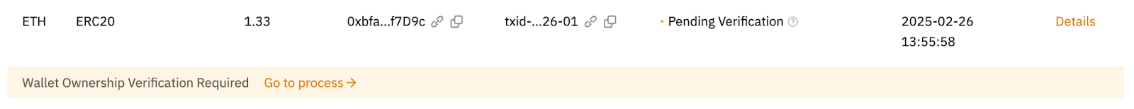 Step 1: Go to your Deposit History, look for the deposit with Wallet Ownership Verification Required, and click on Go to process