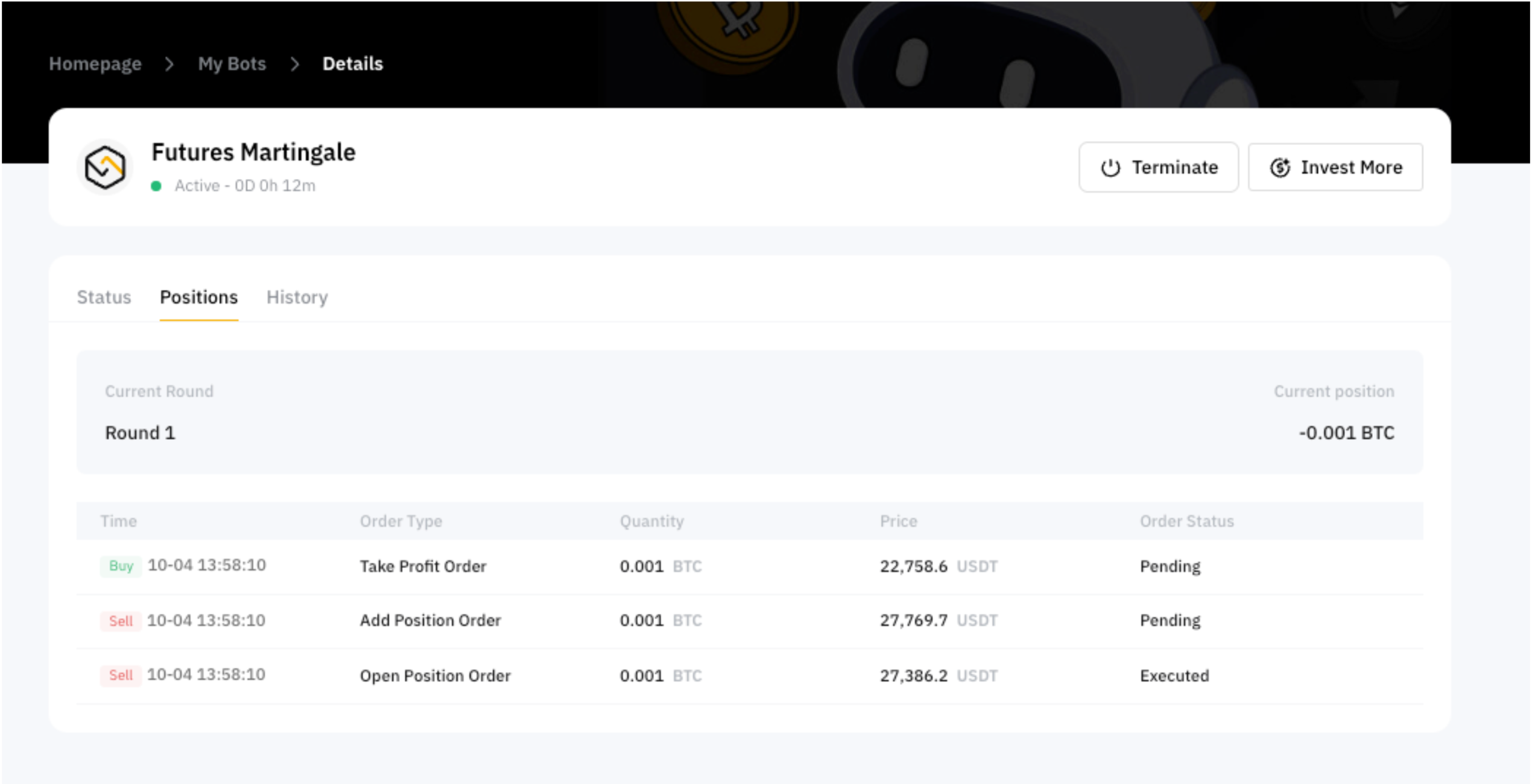ボット詳細ページでは、設定したパラメータなど、先物マーチンゲール取引ボットの包括的な情報をご覧いただけます。これらの設定に加え、注意すべき重要な情報も表示されています。