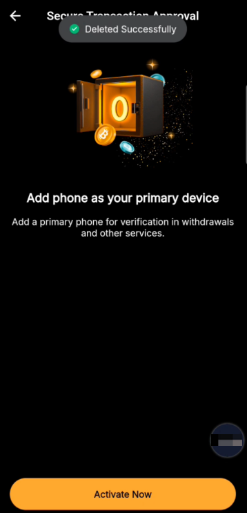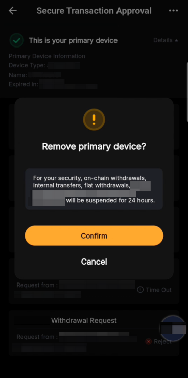 この機能を有効にすると、特定のスマートフォンを主要デバイスとして設定できます。それ以外のすべてのデバイスはその他のデバイスとして扱われます。主要デバイス以外のその他のデバイスまたはBybitウェブサイトから出金やその他の取引を開始すると、主要デバイスのBybitアプリに認証リクエストが送信されます。その後、取引を承認するか、不審な場合は拒否することができます。