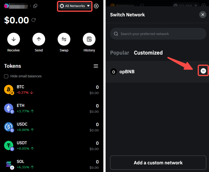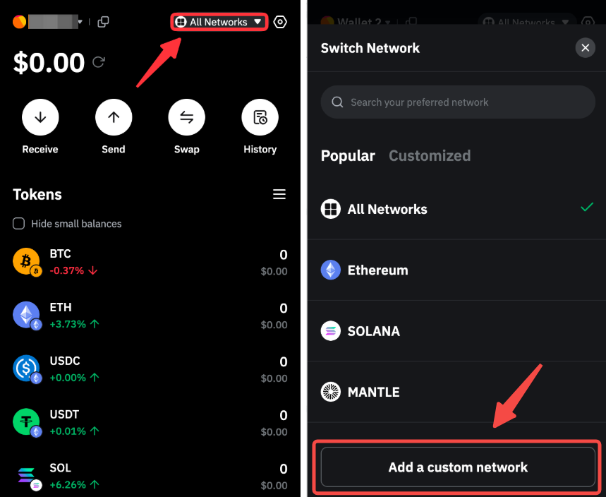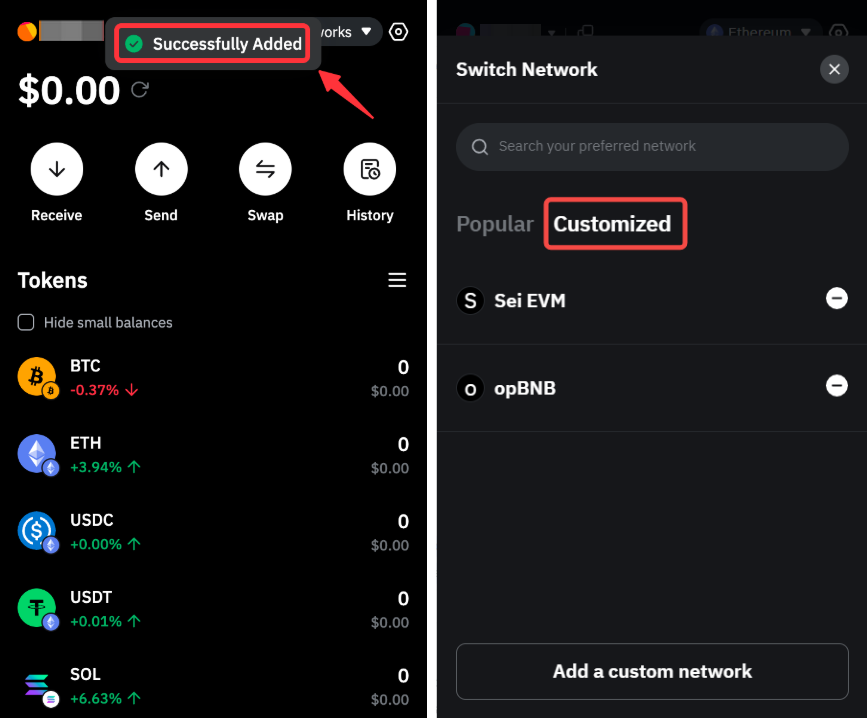 ネットワークはBybitウォレットに正常に追加されます。すべてのカスタムネットワークは、ネットワークページのカスタマイズタブで確認できます。