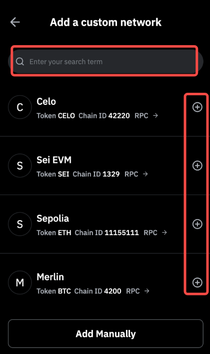 ステップ2:有効なネットワーク名を入力し、ネットワークを見つけたら、+アイコンをタップしてウォレットに追加します。