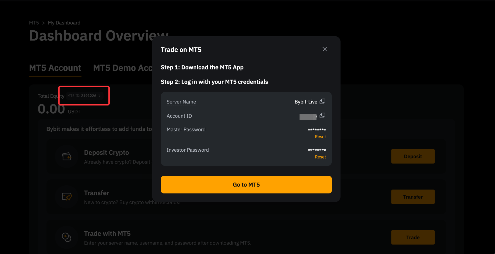 ステップ5:TradFi MT5ダッシュボードを表示し、認証情報を使用してご自身のMT5アカウントにログインします。