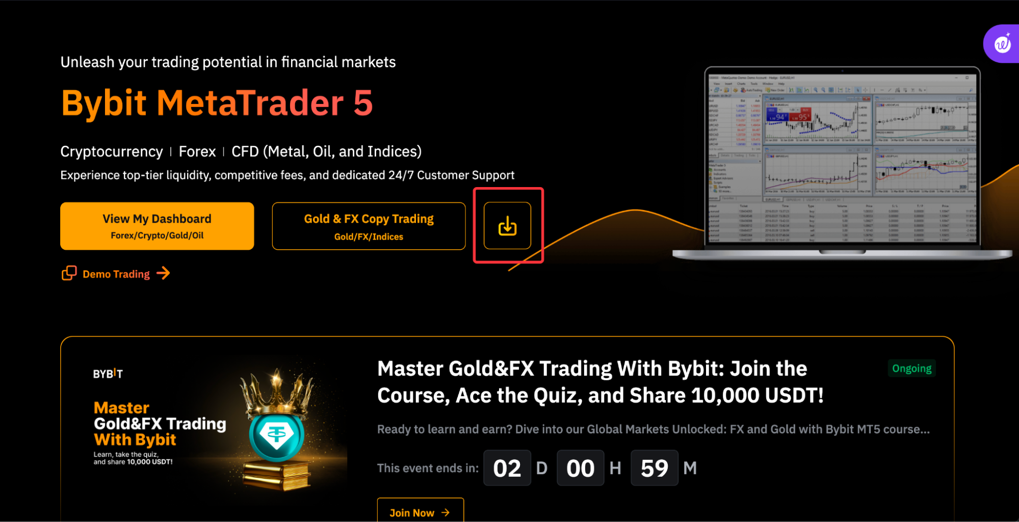 ステップ4:BybitのTradFi MT5ランディングページからMetaTrader5プラットフォームをダウンロードしてインストールします。