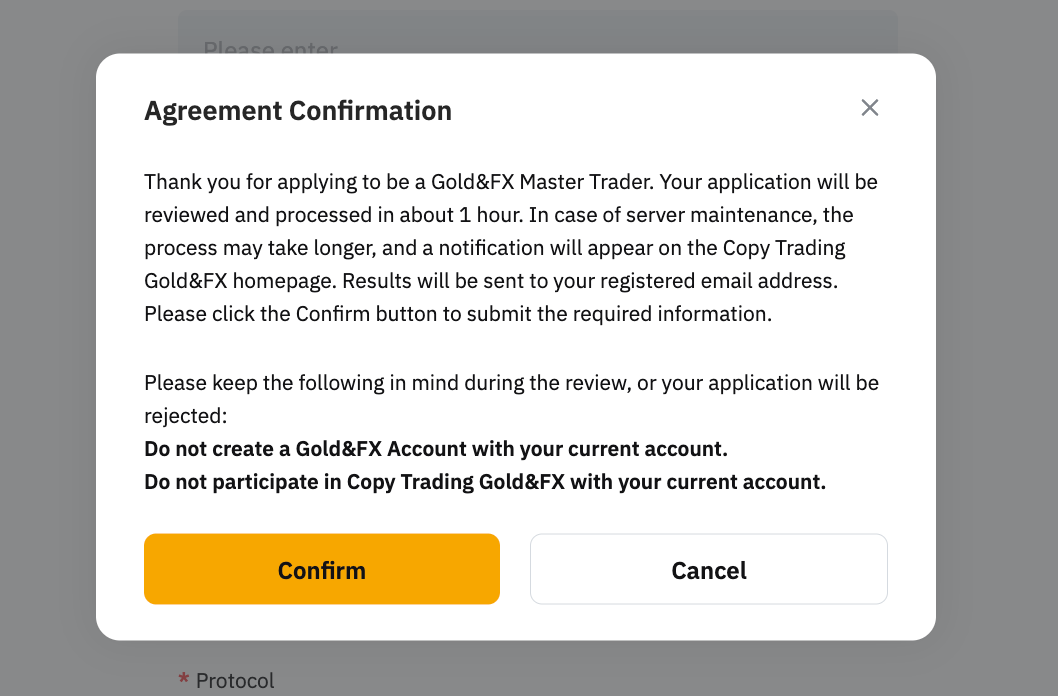:お客様の申し込み資格に影響が生じるおそれがあるため、申し込み審査の間は、TradFiアカウントを作成したり、他のマスタートレーダーをフォローしたりしないでください。