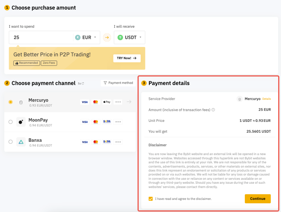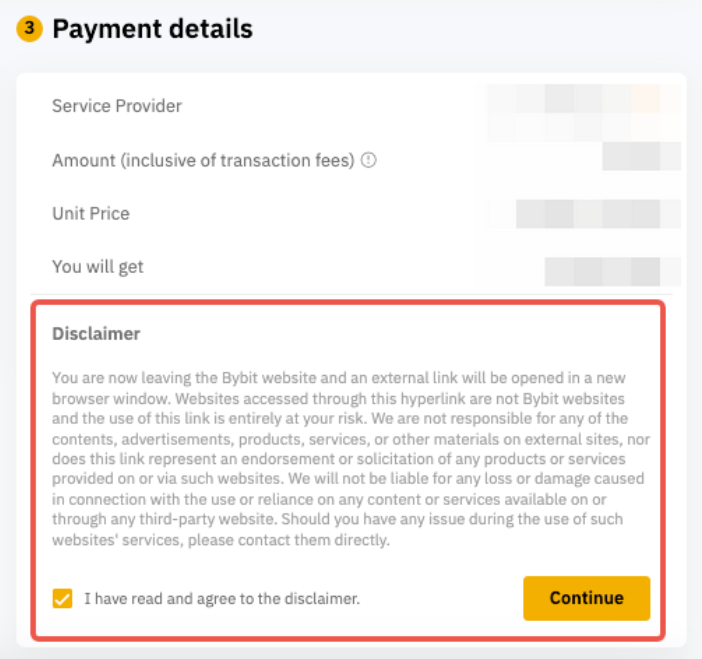 ステップ6: 免責事項を確認し、「続ける」をクリックします。取引を進めるには、サードパーティ決済プロバイダーの公式ウェブページに移動します。