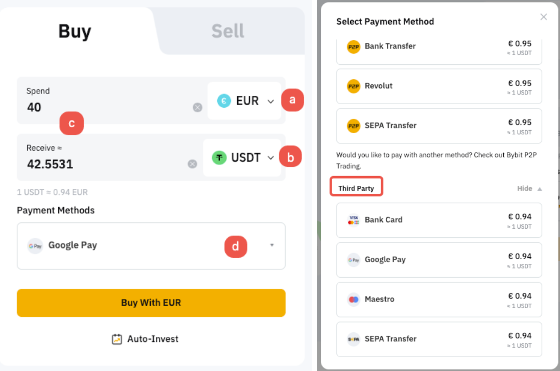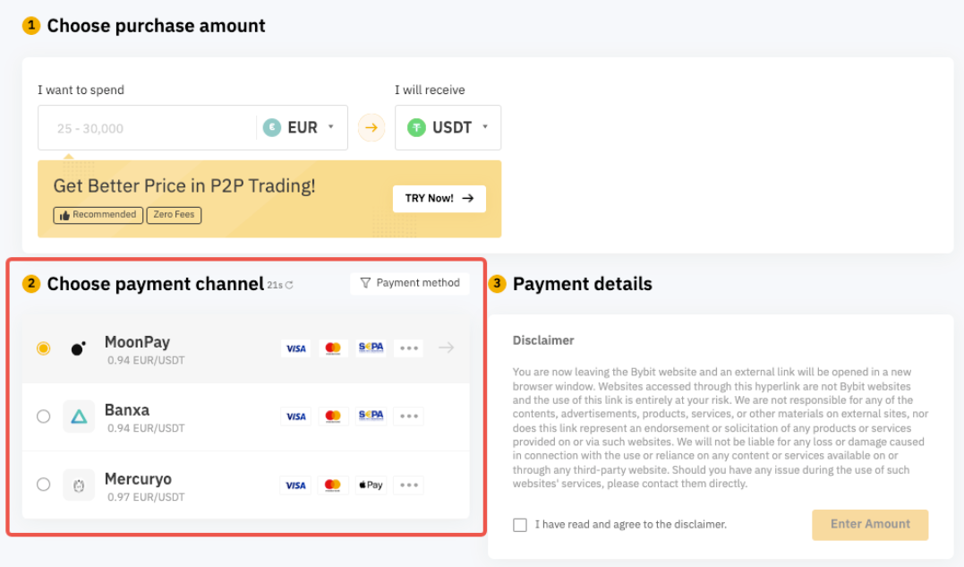 Bybitでは、法定通貨によるご入金は直接お取り扱いしておりません。そのため、暗号資産のご購入は、すべて外部の決済サービスプロバイダー(サードパーティ)を通じて処理されます。