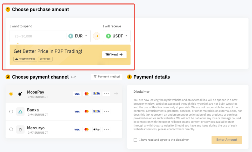 ステップ3:セクション1で、支払いたい法定通貨とBybitアカウントで受け取る通貨を選択します。購入限度額は金額入力ボックスに表示され、プロバイダーによって異なります。