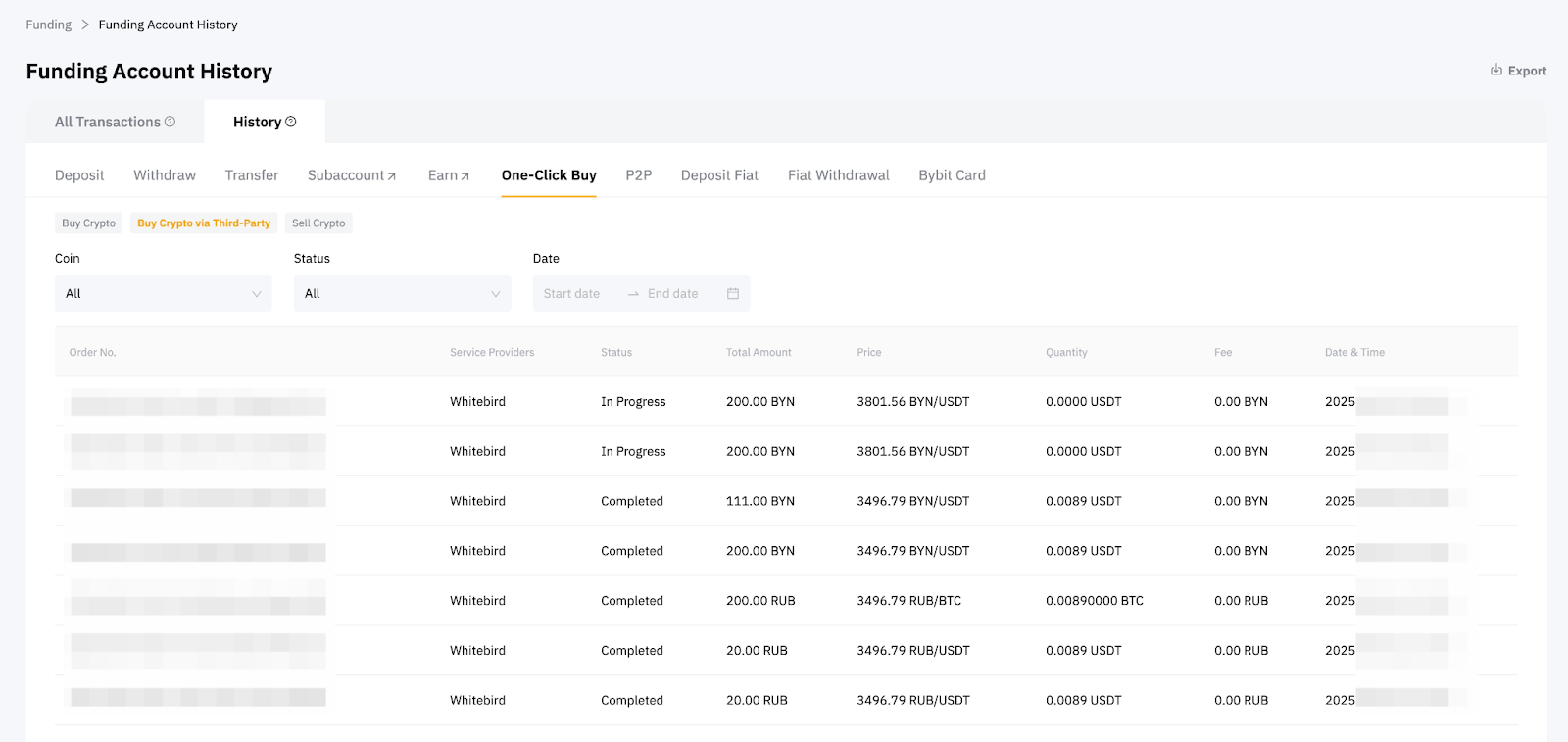 ステップ7: Bybitアカウントで暗号資産を購入した後、購入履歴をクリックすると、過去の取引記録を確認できます。