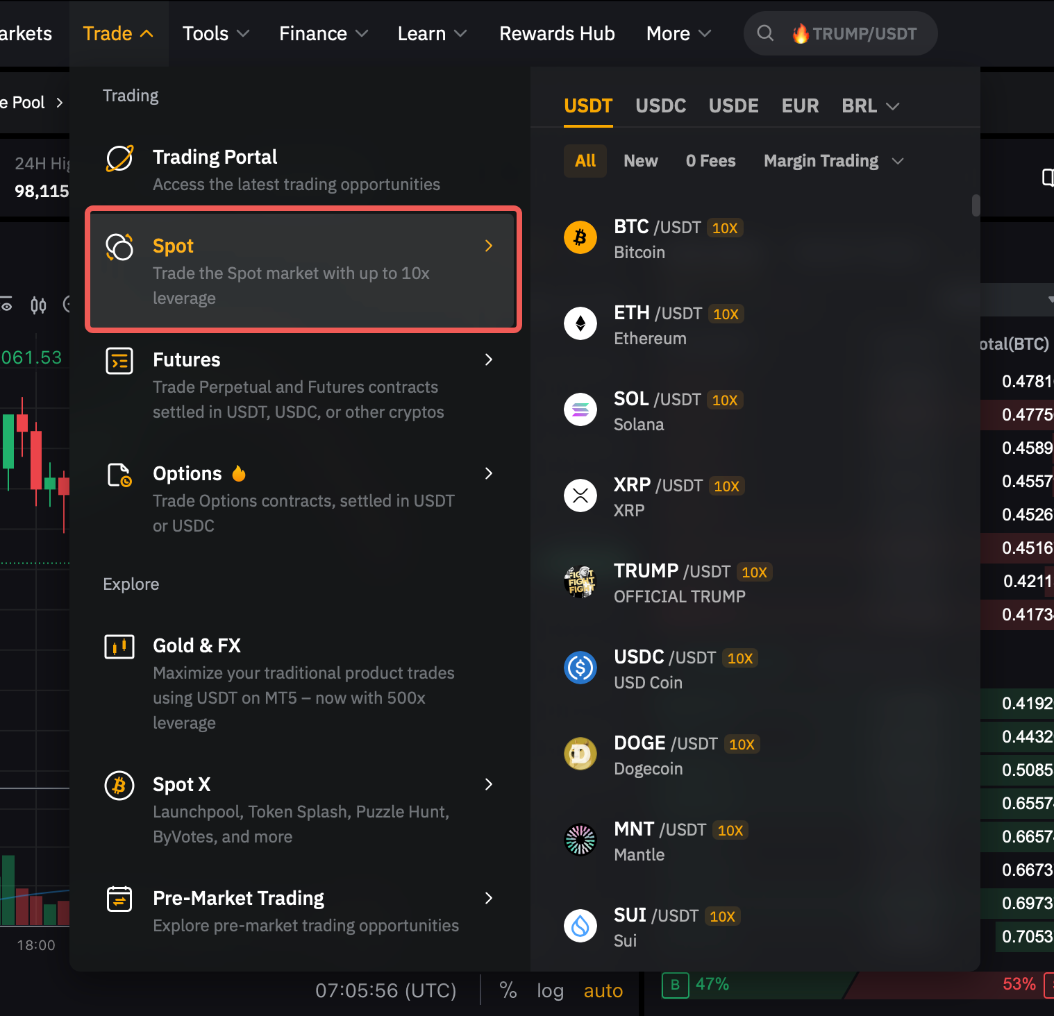 ステップ1:アカウントにログインし、上部のナビゲーションバーで「取引」→「現物」をクリックして、現物取引ページにアクセスします。