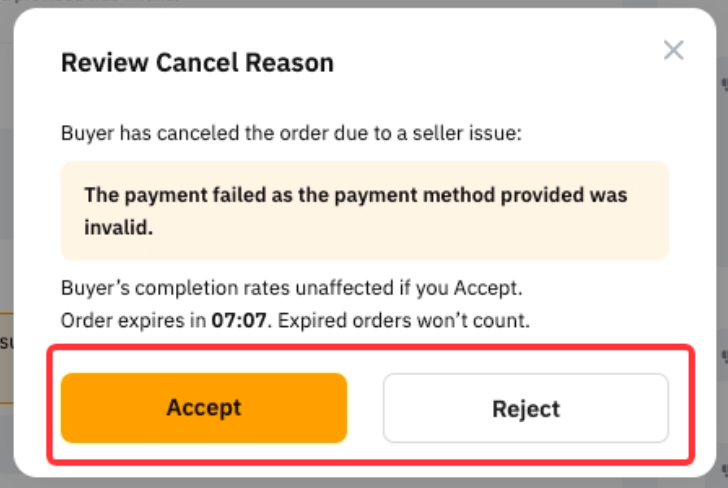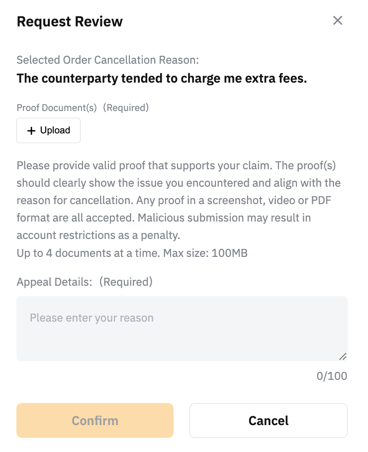 キャンセルが売り手の過失によるものであると確信できる場合は、「リクエストレビュー」をクリックして、有効な証拠を提示のうえ上訴を提出してください。P2Pスペシャリストが1~2営業日以内に対応します。