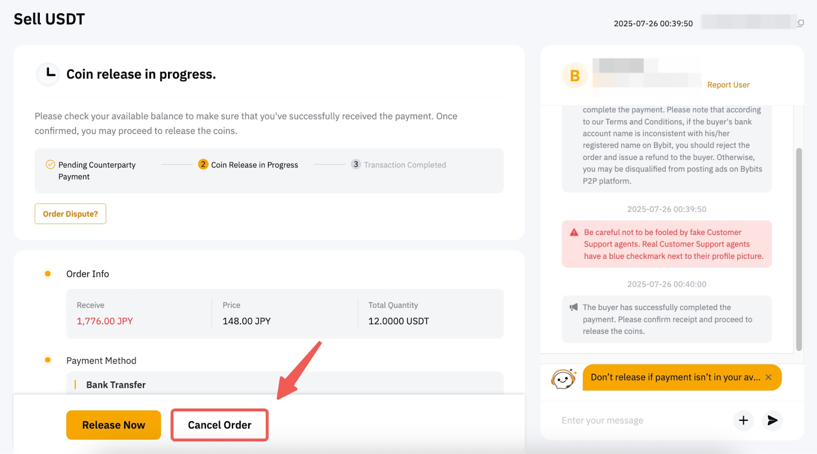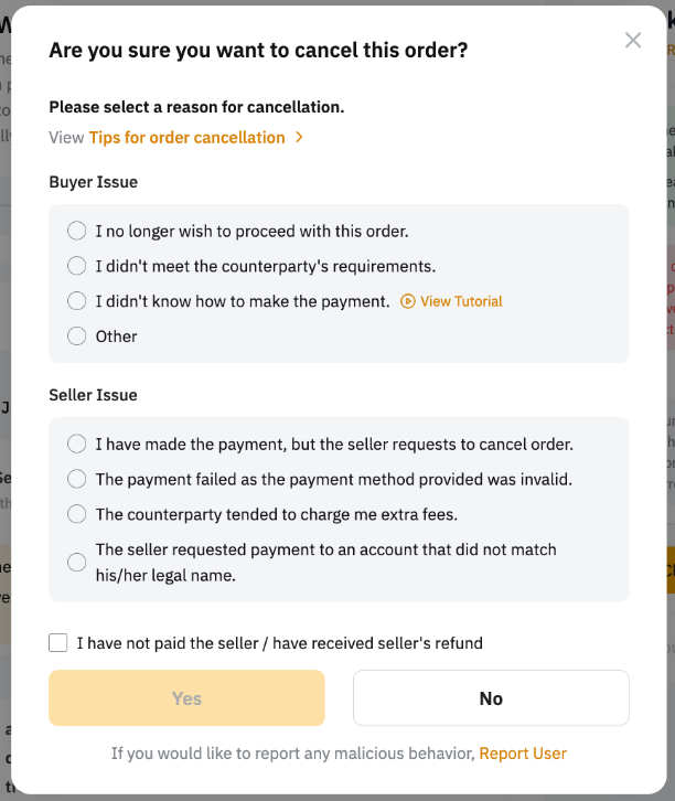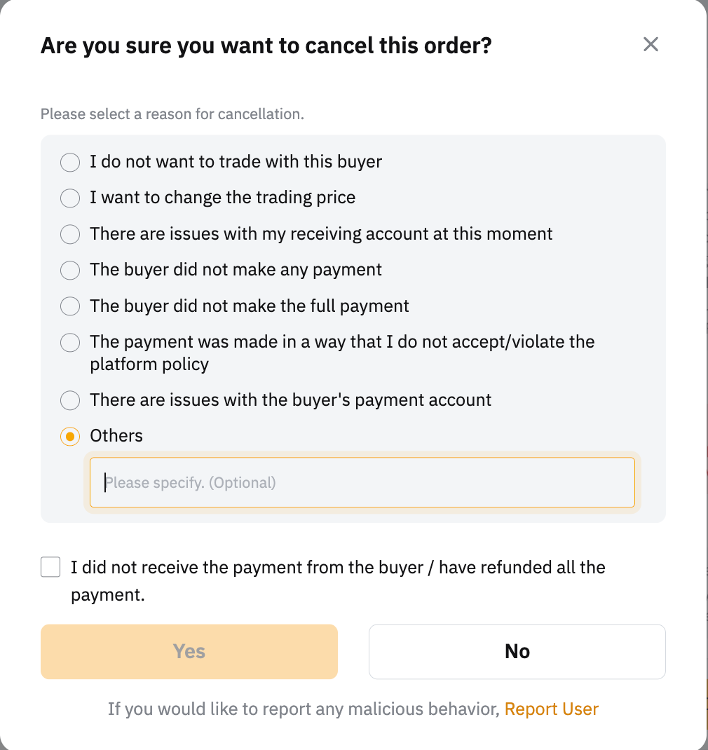 購入者は、注文ステータスが支払い待ちまたはコインリリース中である場合、注文をキャンセルできます。