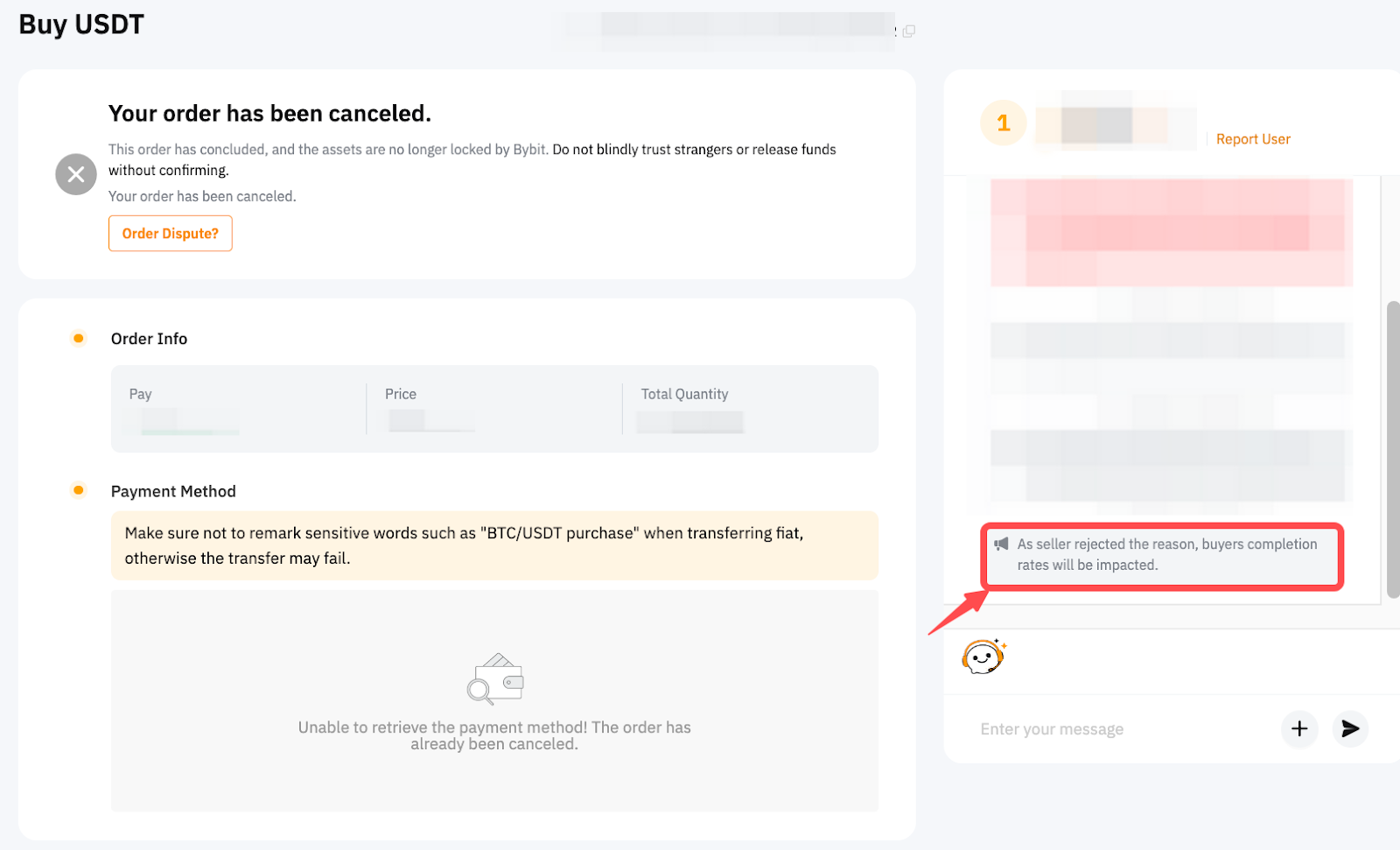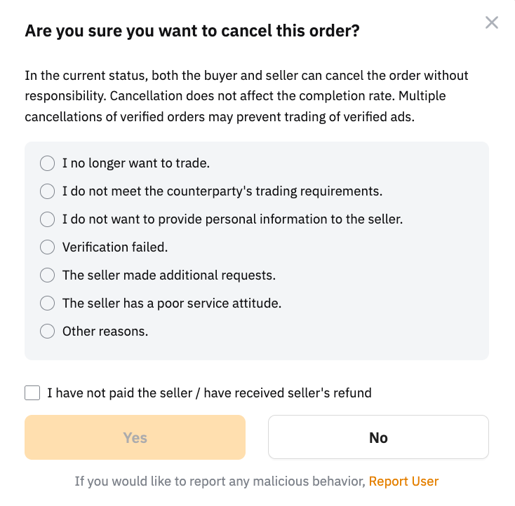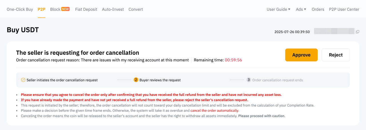 買主は、24時間以内にP2P注文を最大3回までキャンセルできます。取消理由が買主によるもので、取消限度に達した場合、P2P取引機能は24時間使用できなくなります。