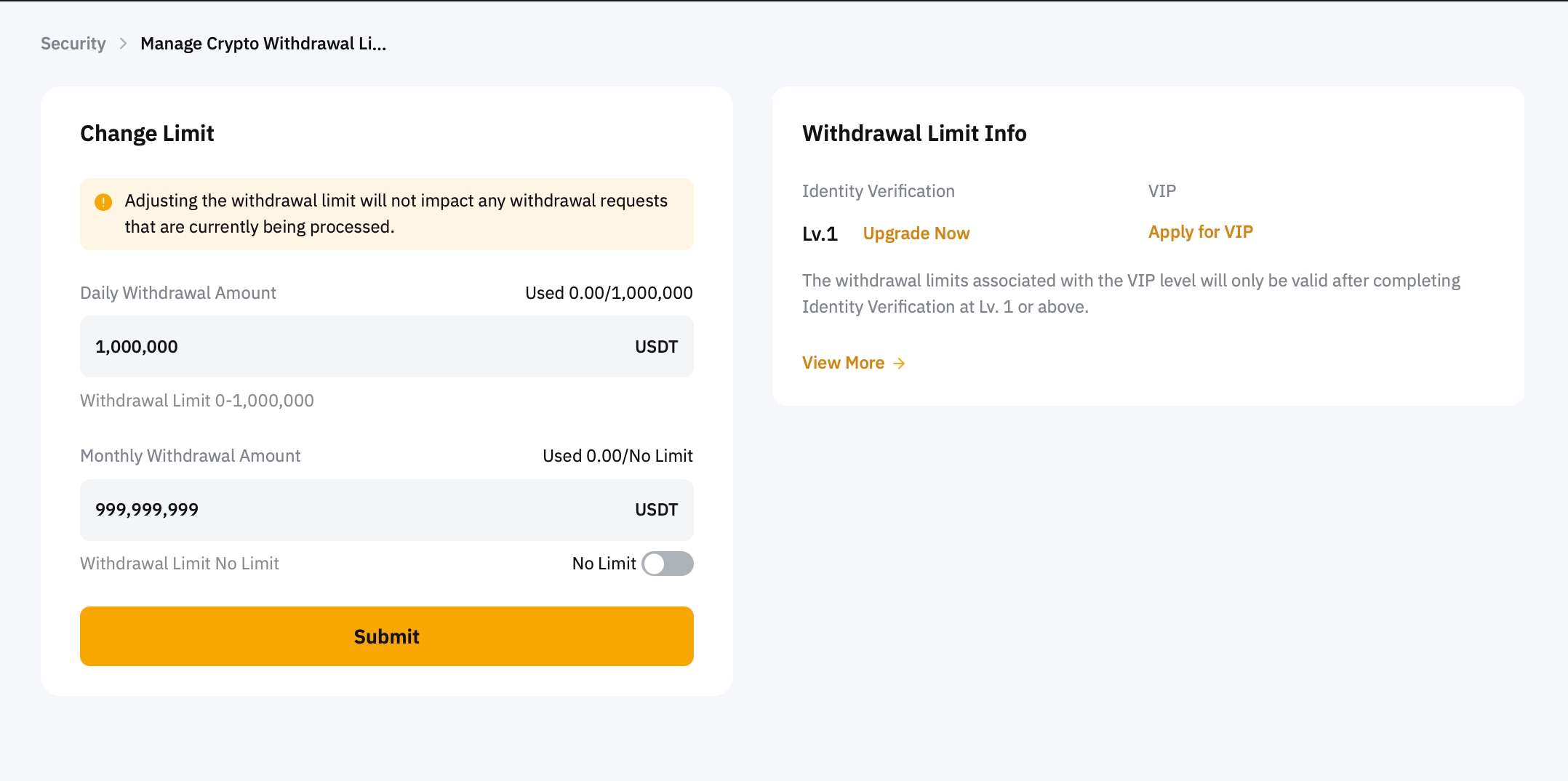ステップ 3: 日次または月次出金限度額を調整し、[提出] をクリックします。ページの右側に、現在の出金限度額の情報が表示されます。各 VIP および本人確認レベルに対する出金限度額の詳細については、こちらをご覧ください。