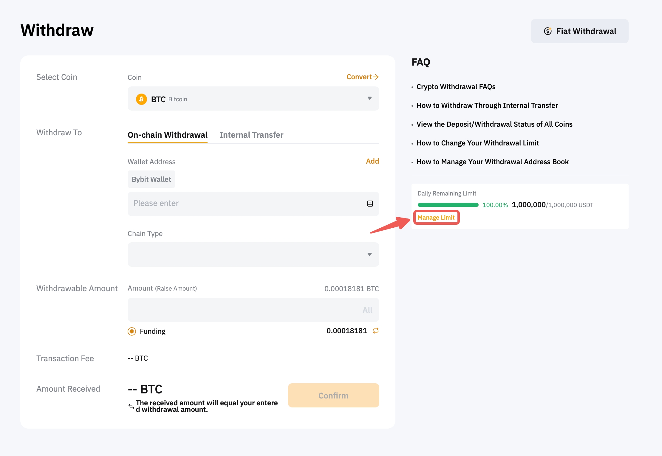 Bybit では、 VIP レベルと本人確認レベルに基づいて利用可能な最大出金限度内で、毎日および毎月の暗号資産出金限度額を管理できます。各 VIP および本人確認レベルに対する出金限度額を確認するには、こちらをご覧ください。