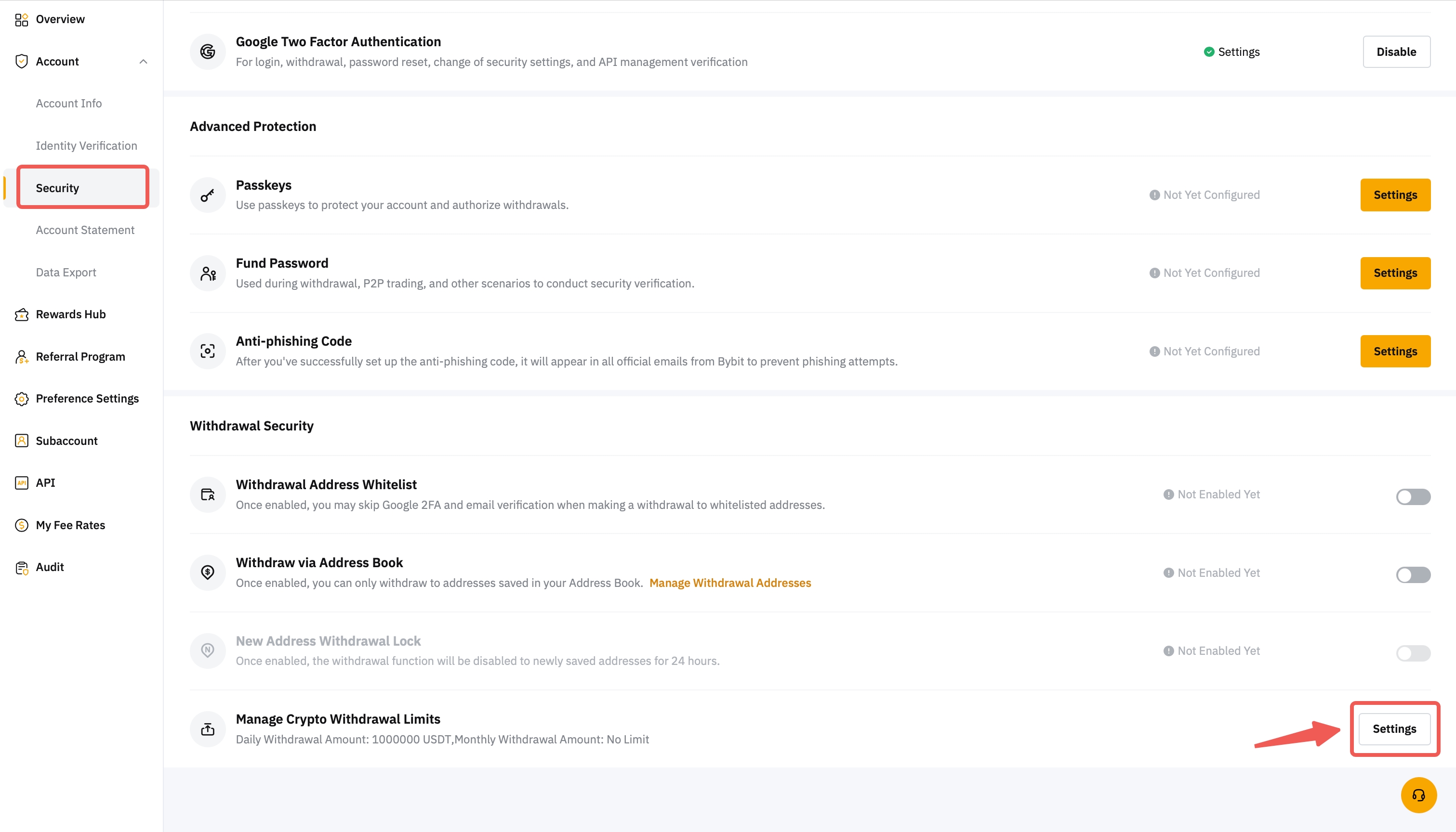 ステップ 2: 出金セキュリティ → 暗号資産の出金限度額の管理 に移動し、設定 ボタンをクリックします。