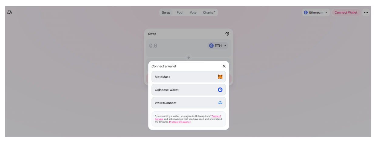 ステップ2:[Uniswap]ページの右上にある[ウォレットに接続]をクリックします。接続するBybit Walletがない場合は、MetaMaskを選択してBybit Walletを連携できます。 続行する前に、Bybit Wallet拡張機能が追加されていることを確認してください。