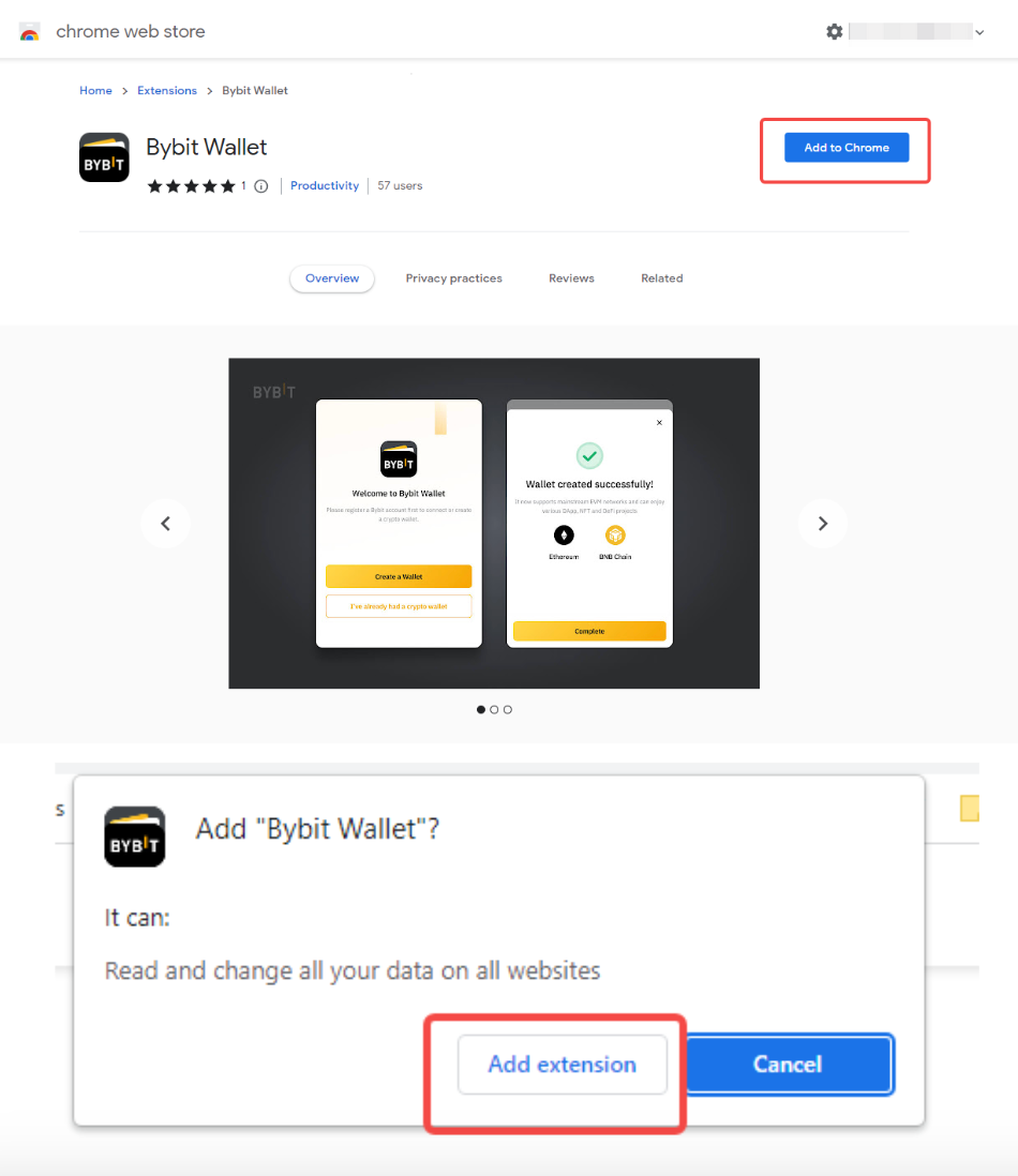 ステップ2:拡張機能の[Bybit Wallet]をインストールするには、[Chromeに追加]をクリックします。次に[拡張機能を追加]をクリックします。