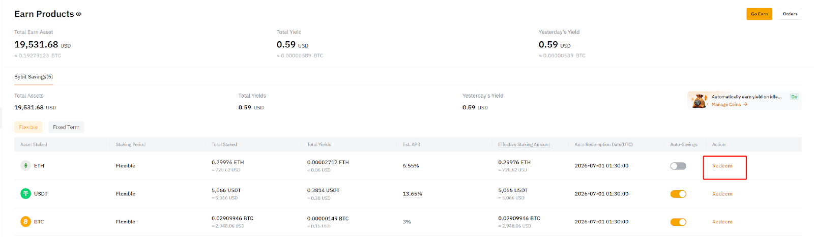 注:定期商品の場合、商品が満期を迎えるまで資産を償還することはできません。満期になると、元本と利回りは自動的に資金調達アカウントに入金されます。その際、特別な操作は必要ありません。