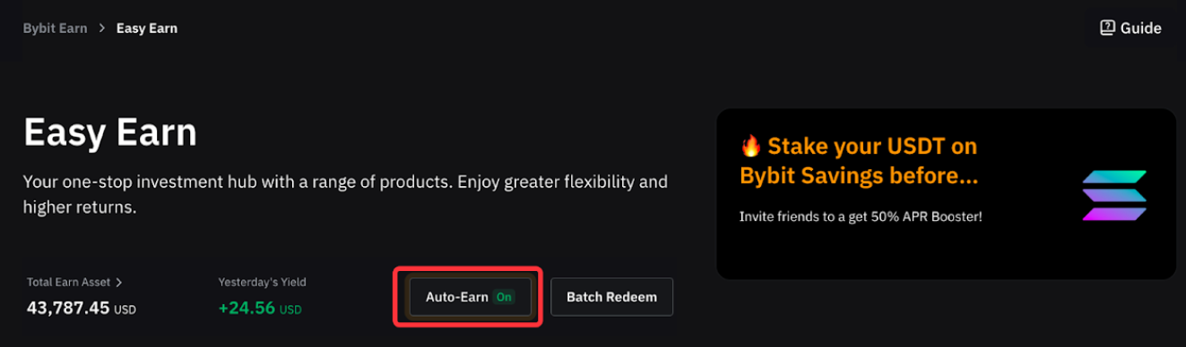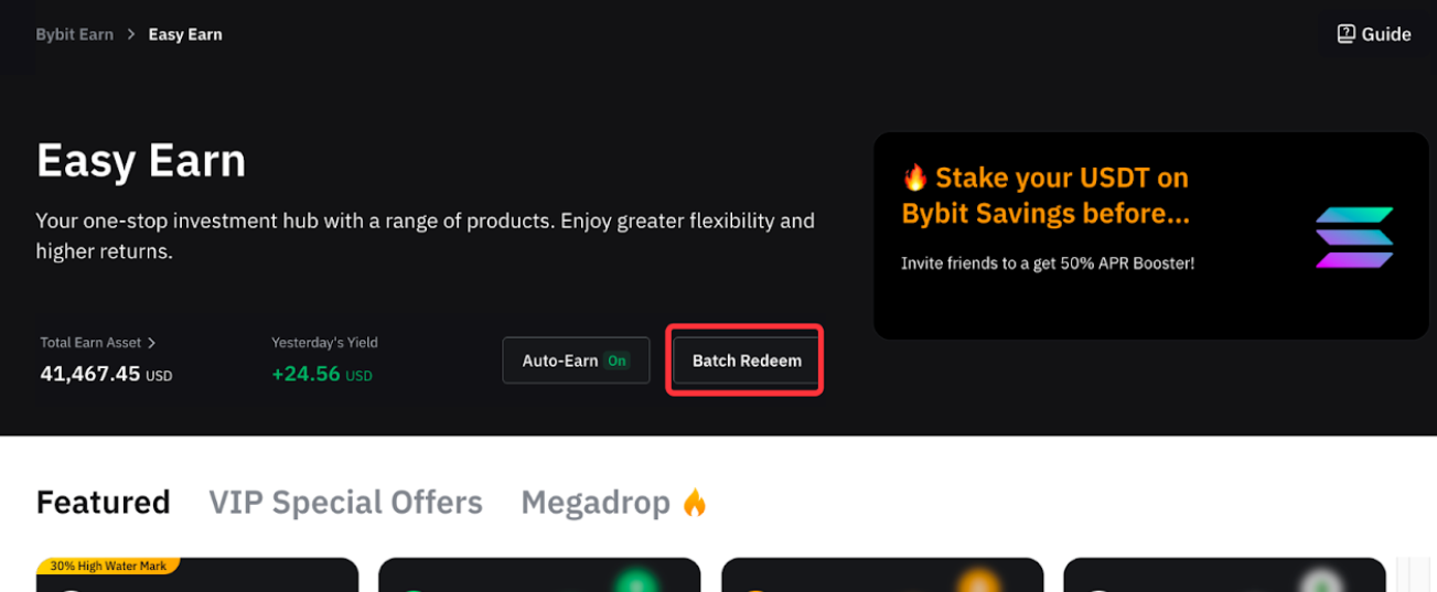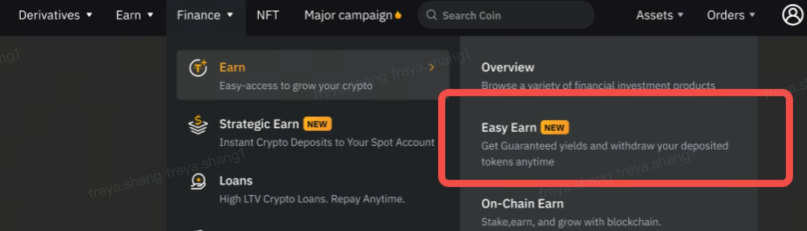 ステップ1:Bybitアカウントにログインし、ナビゲーションバーで「ファイナンス」→「資産運用」→「かんたん資産運用」の順にクリックします。