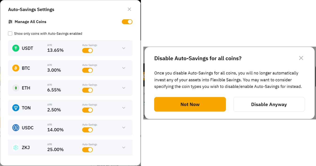 ステップ2:自動資産運用の設定ページが表示されます。すべての通貨の自動資産運用を一括で無効にするには、「全通貨を管理」をオフにします。または、各通貨の自動資産運用を個別にオフに切り替えることもできます。