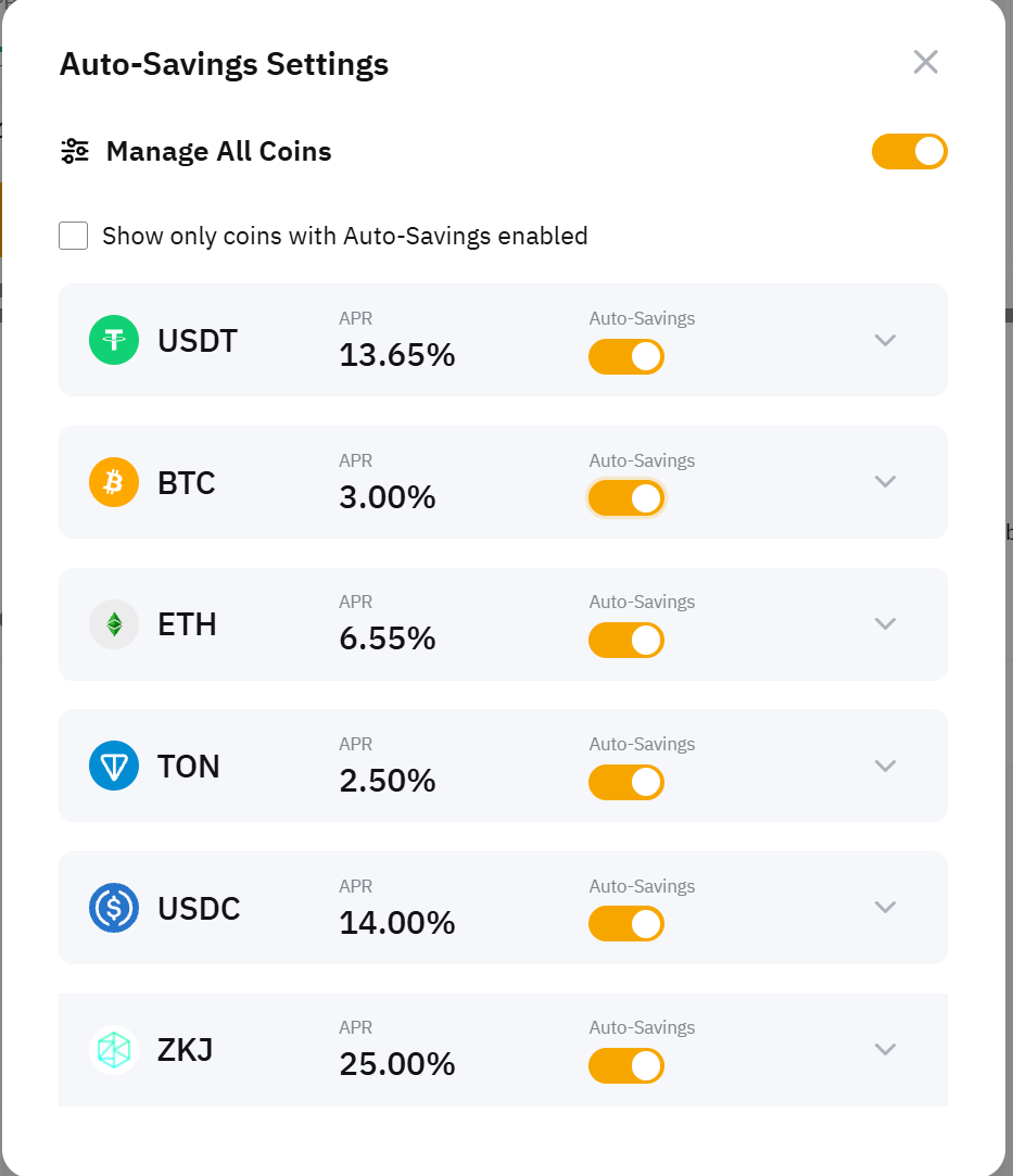 ステップ3:確定」をクリックします。自動資産運用の設定ページが表示されます。デフォルトでは「全通貨を管理」が有効になっています。ここで、サポートされている各通貨の自動資産運用のオン/オフを切り替えることができます。