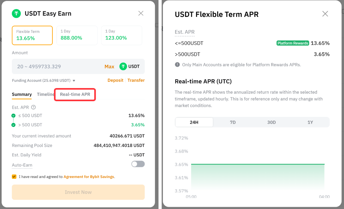 積立商品では、リアルタイムAPRアイコンが表示されます。これをクリックして期間(24時間、7日、30日、1年)を切り替えると、それぞれの期間のパフォーマンスを確認できます。点線の下線は、APRが投資額に基づいて段階的に変動することを示しています。