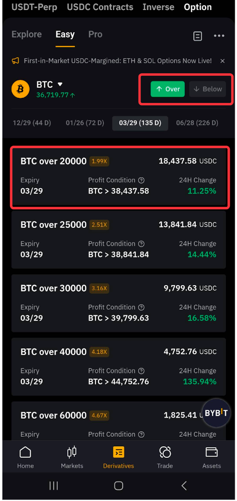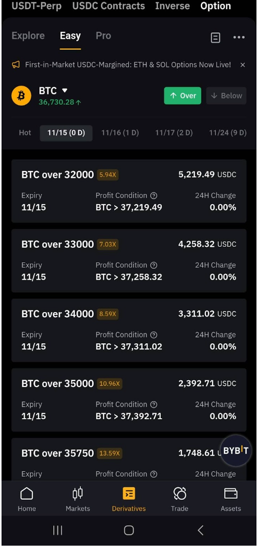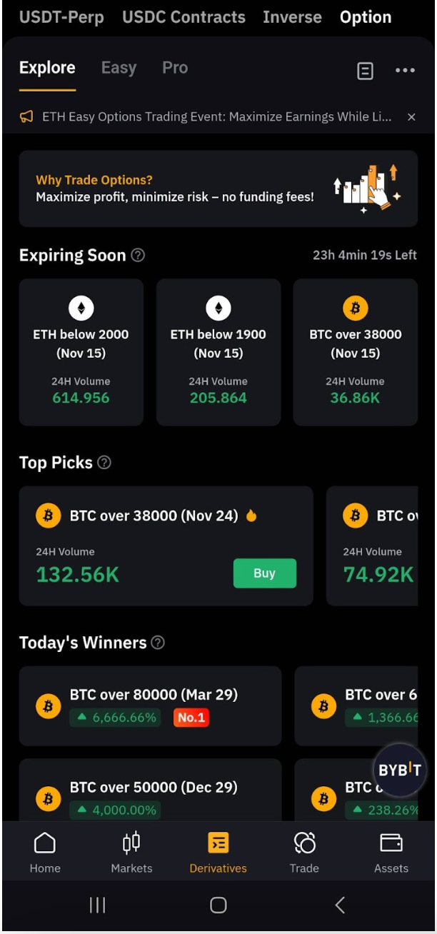 かんたんオプションにアクセスするには、まずBybitアプリを起動します。トップ画面にある「契約」を選択して、「オプション」をタップします。オプション取引のページへ移り、オプション取引の経験に応じて、3つのモードから選択できます。