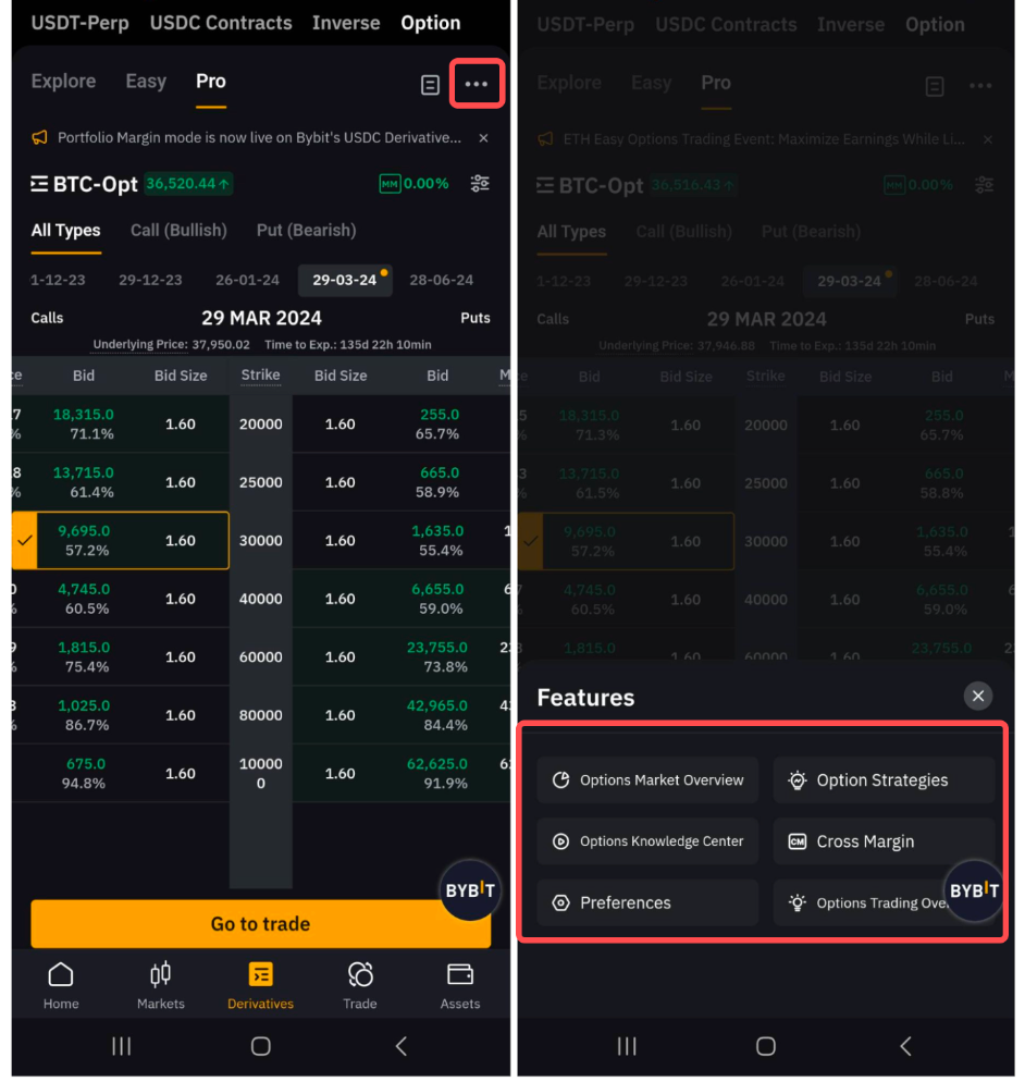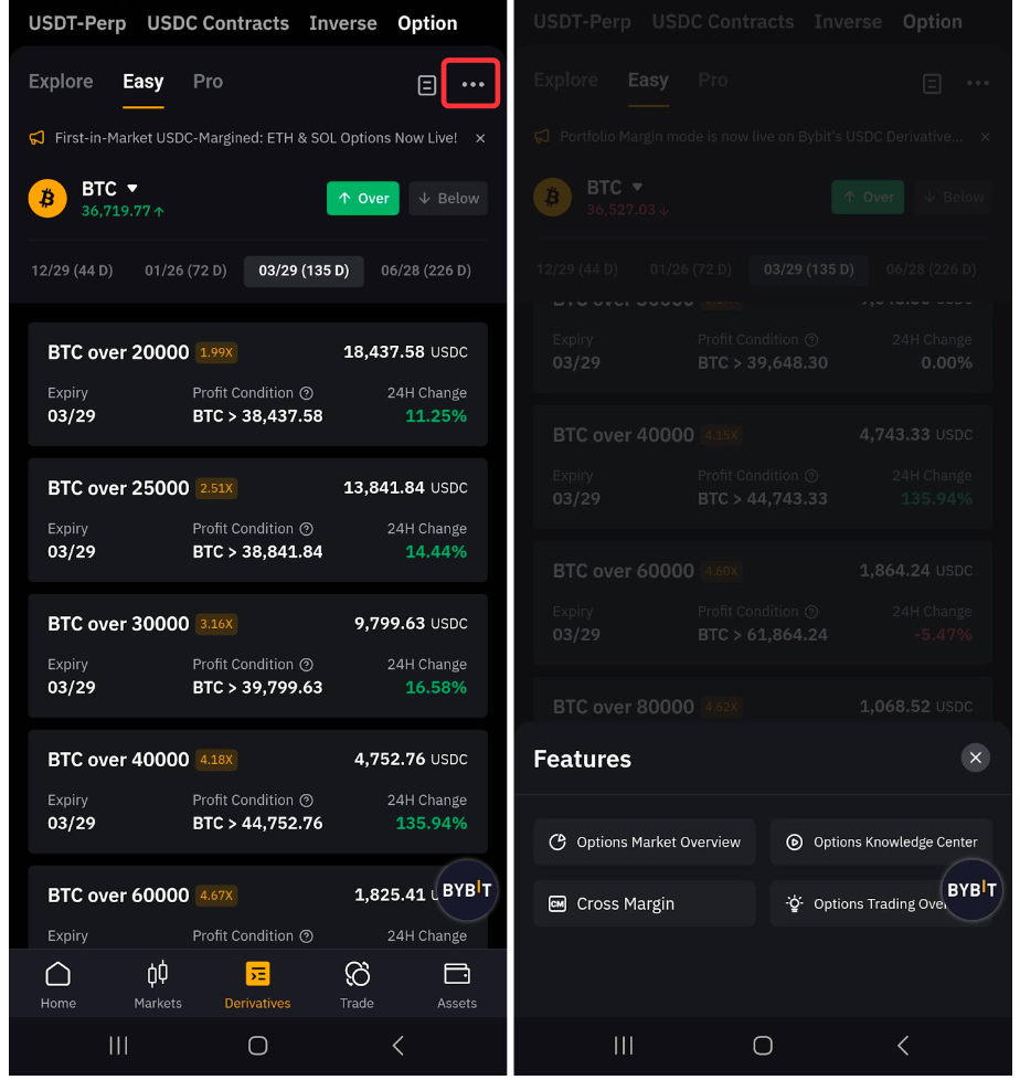 トレーダーは、オプション市場概要、オプション知識ベース、オプション取引概要などの追加情報にアクセスしたり、三点リーダーをタップして、異なるマージンモードに切り替えたりすることもできます。