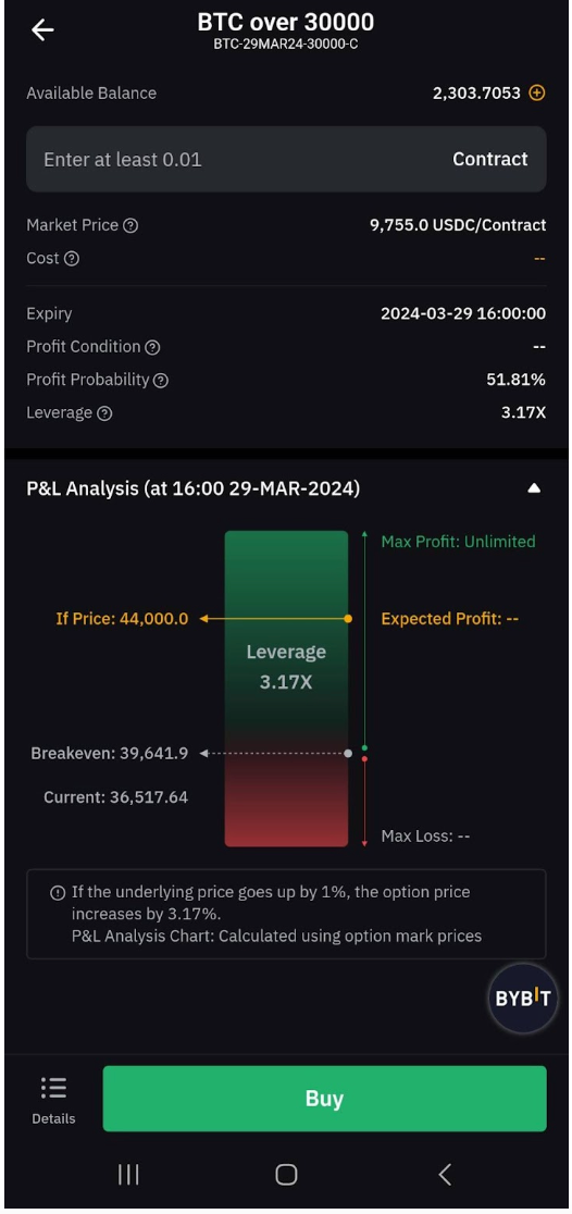 以下の損益分析チャートは、現在の市場価格、マーク価格に基づいてシミュレーションされた損益、損益分岐点、およびシミュレーション中の最適損益状況を示しています。詳細を確認後、トレーダーは「買い」をタップして契約を購入することができます。