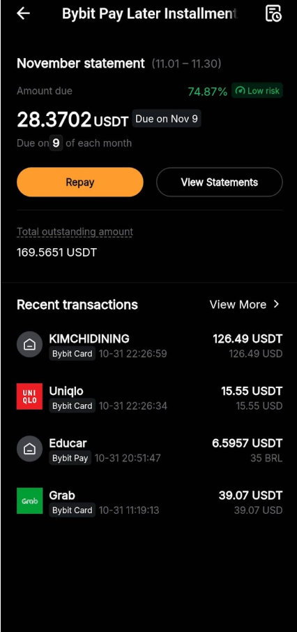 Note: The total outstanding balance and available limit shown on your dashboard are shared across all Pay Later transactions, whether made through Bybit Card or Bybit Pay. This means that even if you've only used Pay Later with Bybit Pay (and not your Bybit Card), the outstanding balance will still appear on your Bybit Card dashboard — and vice versa.