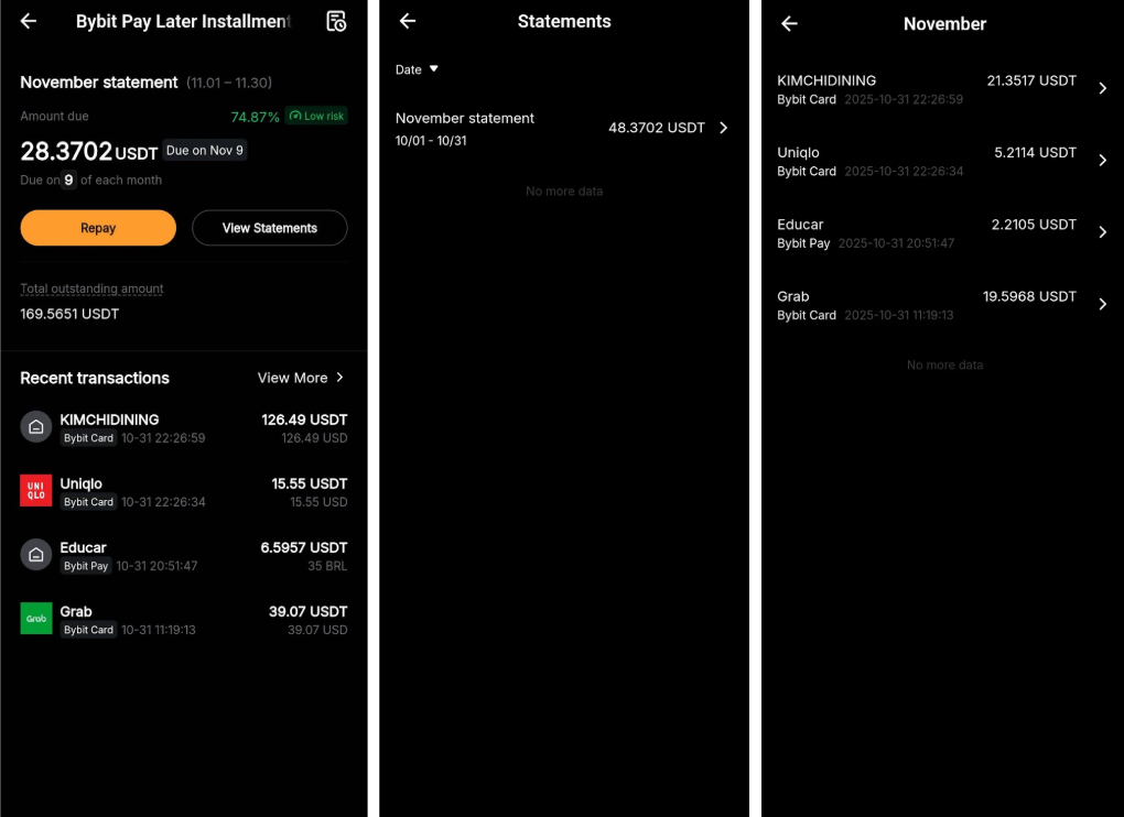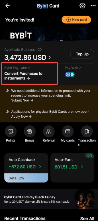 Step 2: Use your Bybit Card to make a purchase with your own funds first. Then, go to the Bybit Card homepage and tap the Bybit Pay Later dashboard.