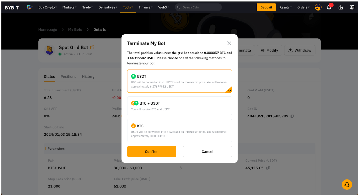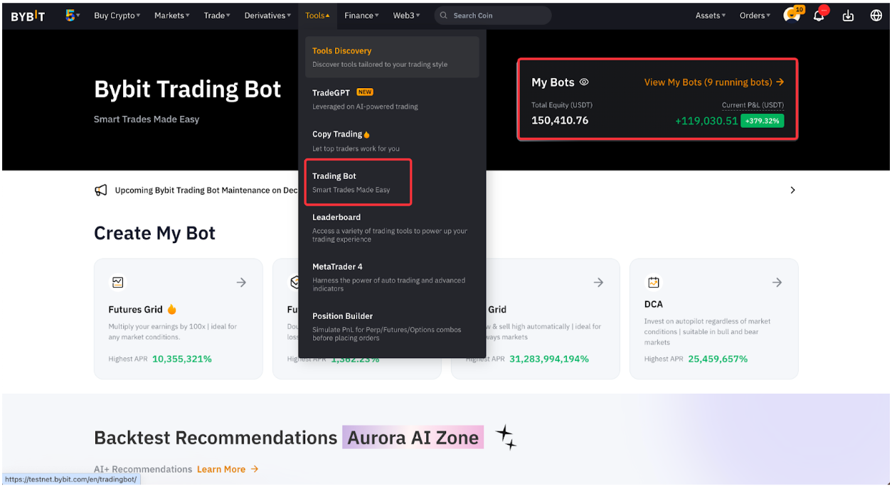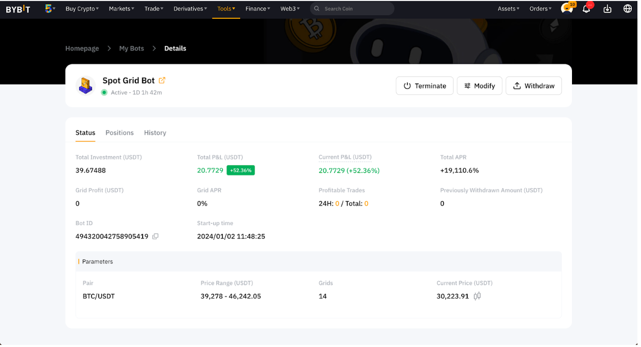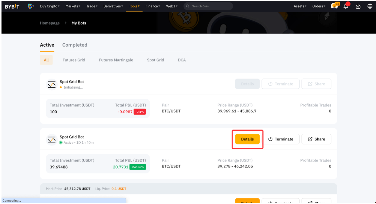 Bybit取引ボットを作成したことがある場合、Bybit取引ボットのページの右上隅にある「マイボット」で合計資産(USDT)および現在の損益(USDT)を確認できます。