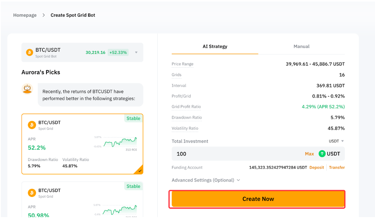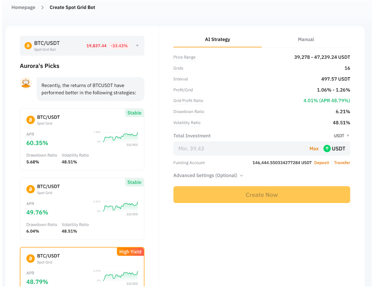 自動設定を使用すると、システムにより、過去の現物通貨ペアの取引実績データに基づくパラメータが推奨されます。または、お客様の設定に基づき、お客様はAurora AIのおすすめを参照して現物取引ボットを作成することもできます。