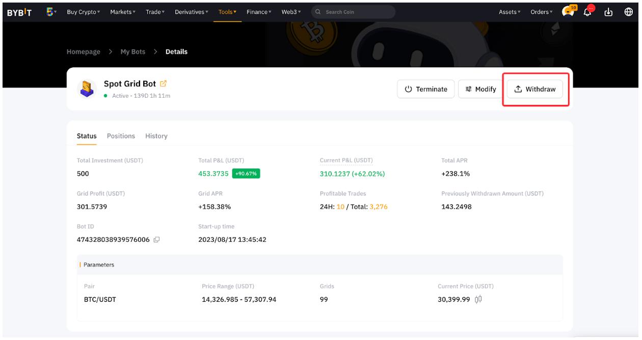 現物取引ボットの利益を出金するには、ボットの「詳細」に移動し、「出金」をクリックします。