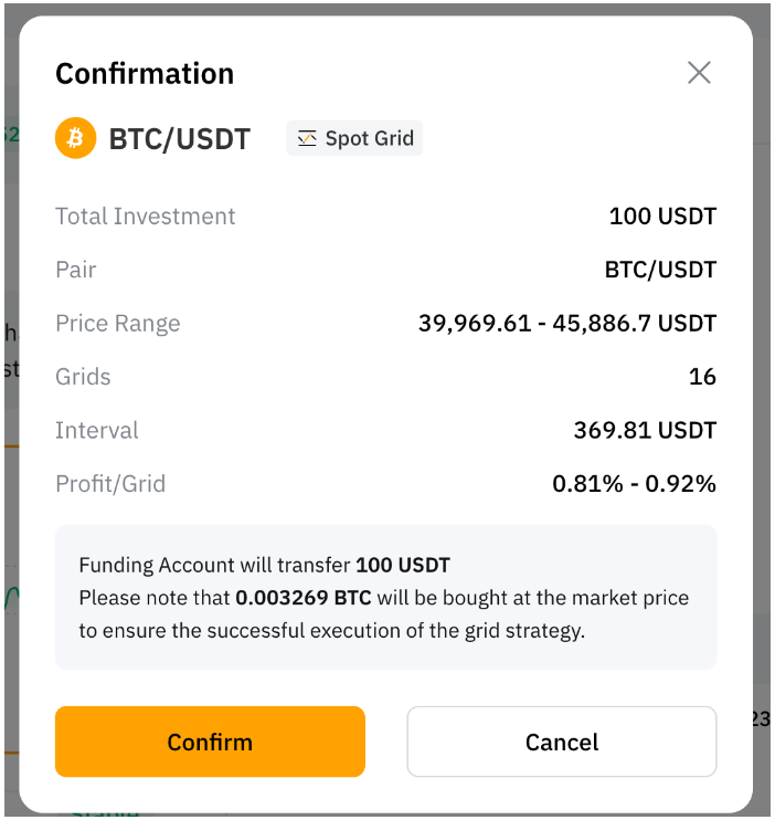 ステップ4:作成した取引ボットの情報を再確認し、「確定」をクリックすると取引が始まります。