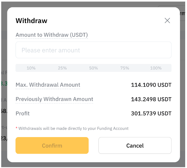 手数料控除後のグリッド利益を限度に出金できます。出金ウィンドウに表示された「Max. Withdrawal Amount(出金限度額)」を参照してください。出金額は、資金調達アカウントに入金されます。