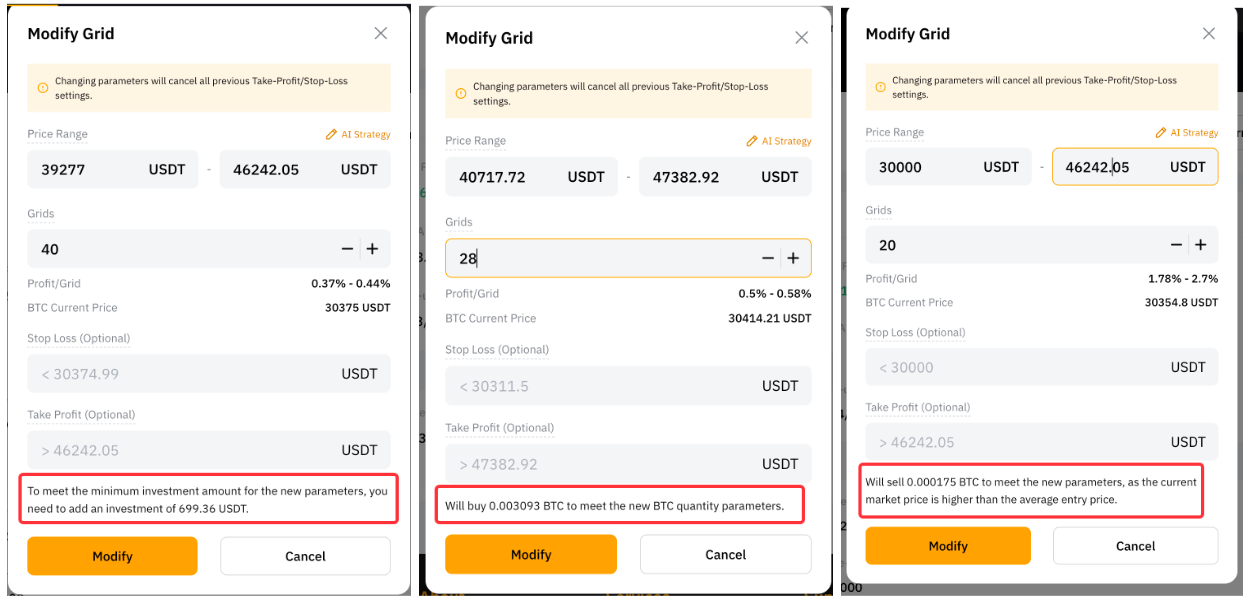 ステップ2:価格範囲、グリッド、利食/損切を修正します。新しいパラメータの設定には、追加の投資額やベーストークンの売買数量の修正が必要になる場合があります。